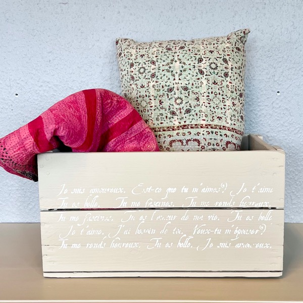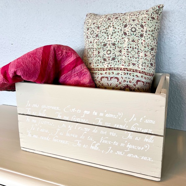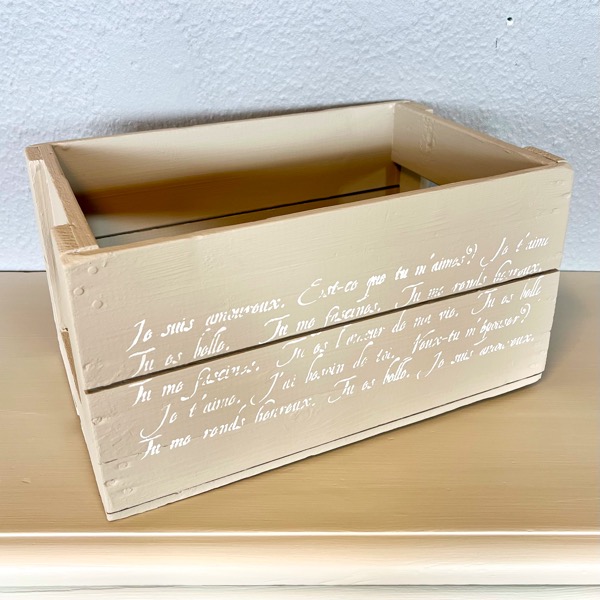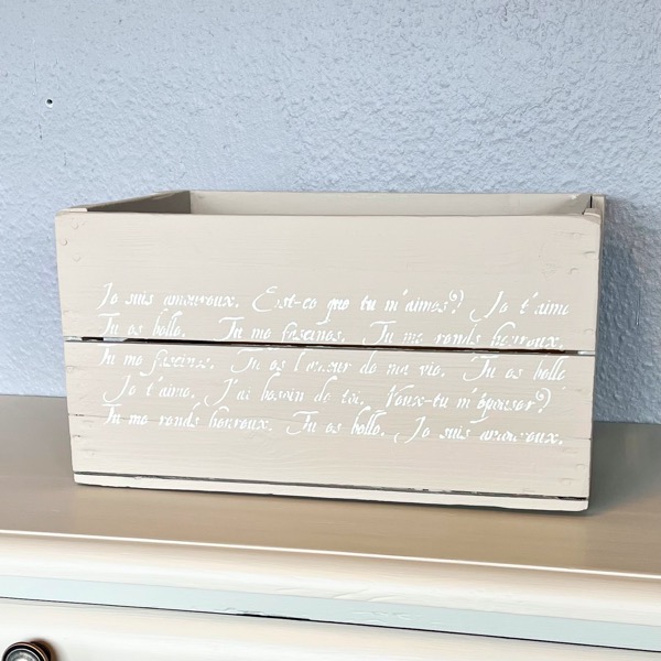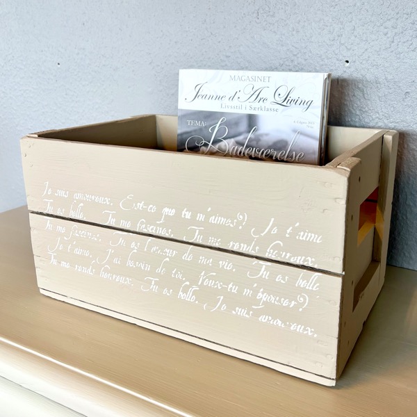 Malet i en lækker lys sandfarve og dertil stencil med en romantisk fransk kærlighedserklæring.