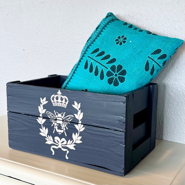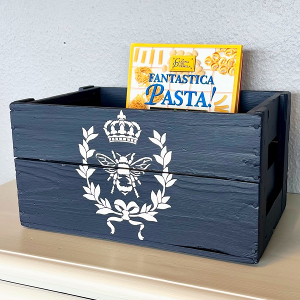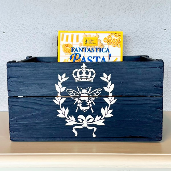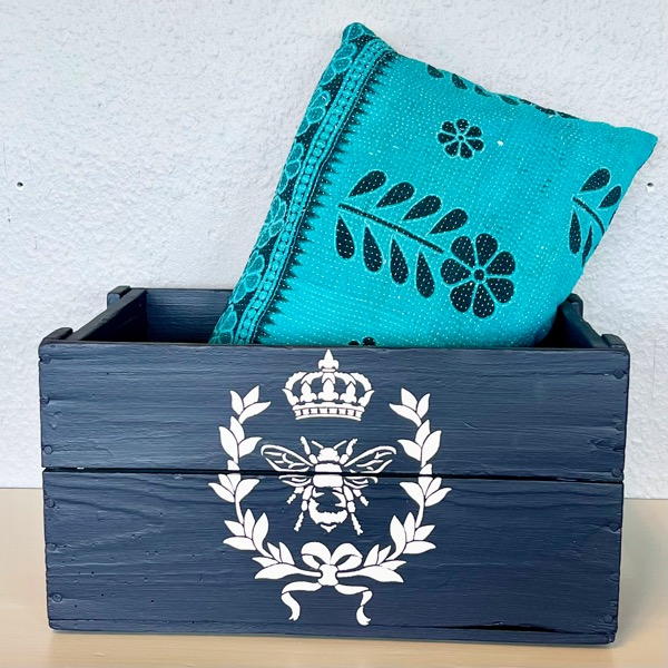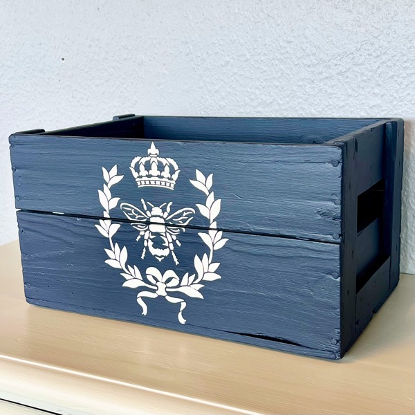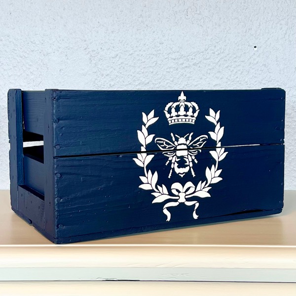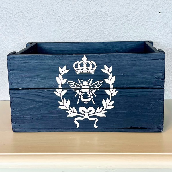 Malet i en dyb mørkeblå (Sailors Blue) og dertil stencil med motiv af en bi og en krone omkranset af et par lauerbærgrene.