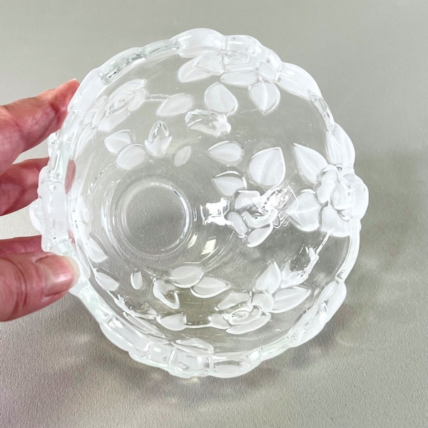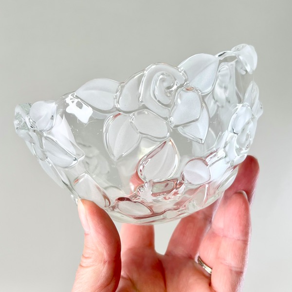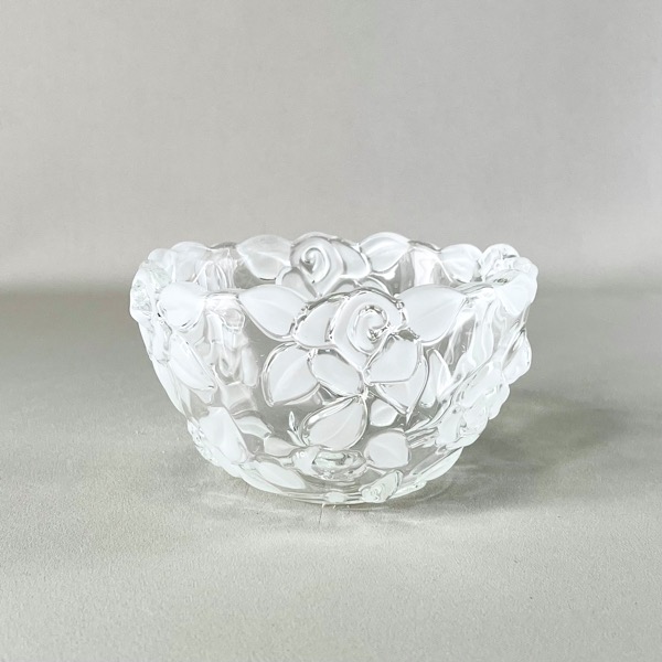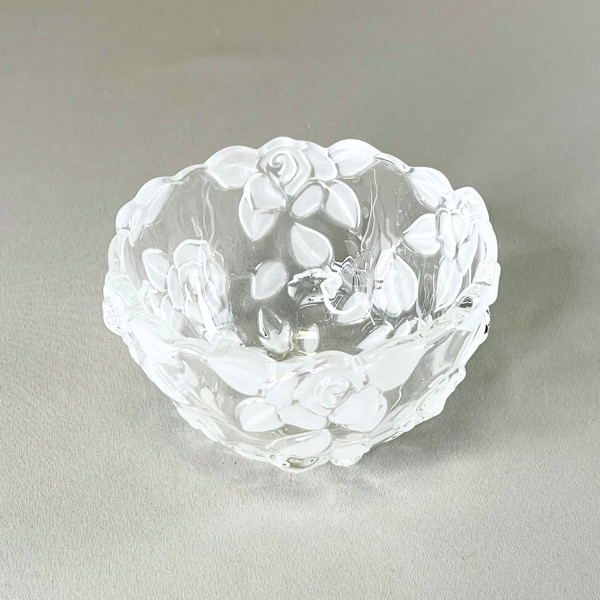 Virkelig smuk dyb skål i klart glas med frostede roser.