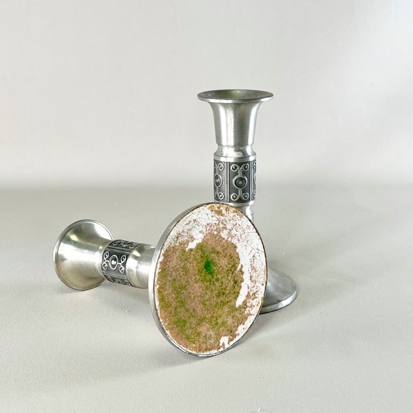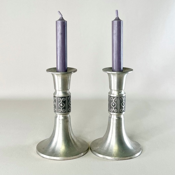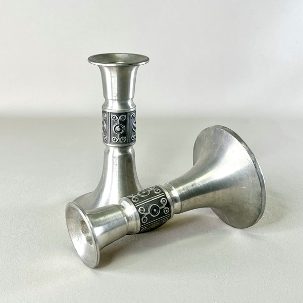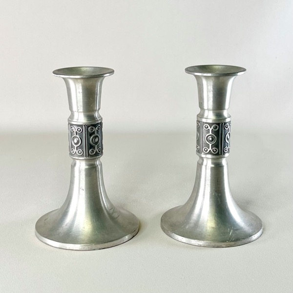 Et par flotte lysestager i tin fra norske Haugrund Pewter fra midt 1960'erne.