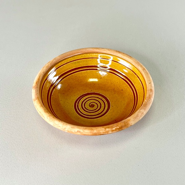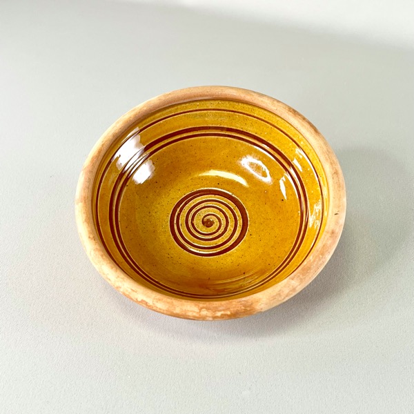 Super flot stand - ingen skår, men et flot rustikt udtryk. Farven er sennepsgul og med brunlig swirl mønster.