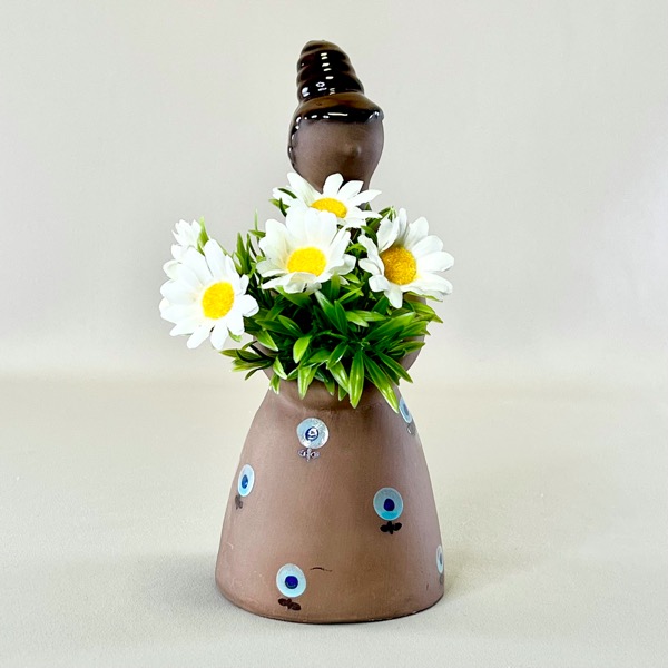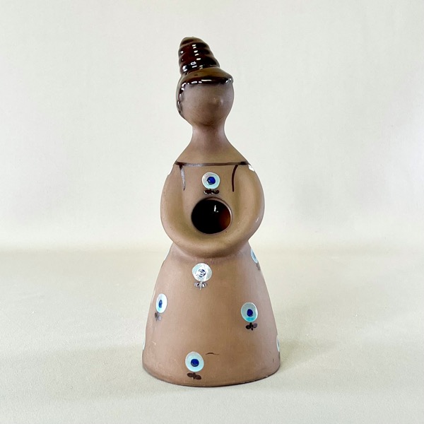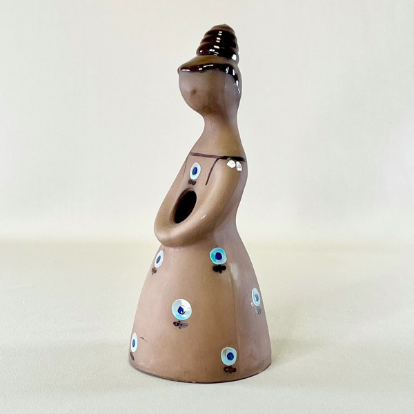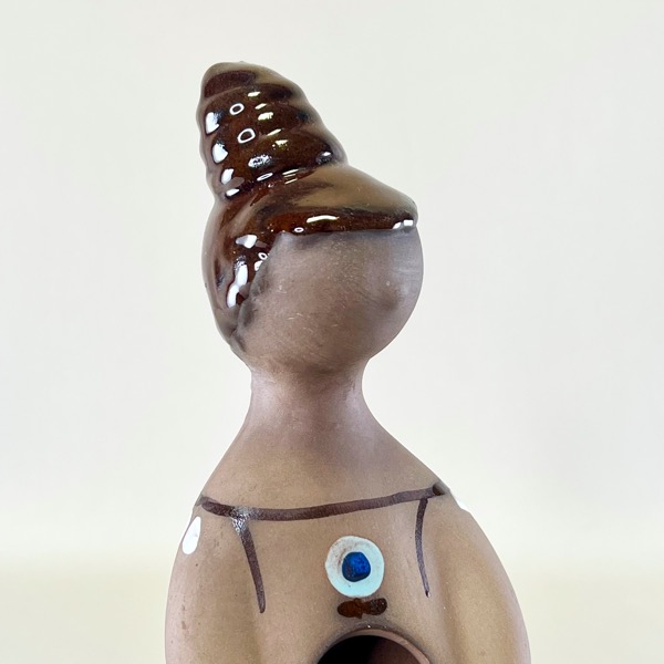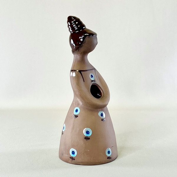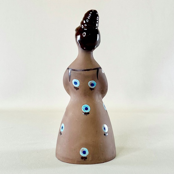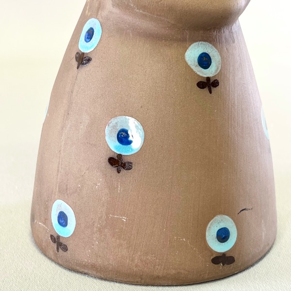 Figuren er mørkebrun mat ler, mens hendes høje frisure er i blank brun glasur og blomsterne på kjolen i flot turkis/blå glasur.