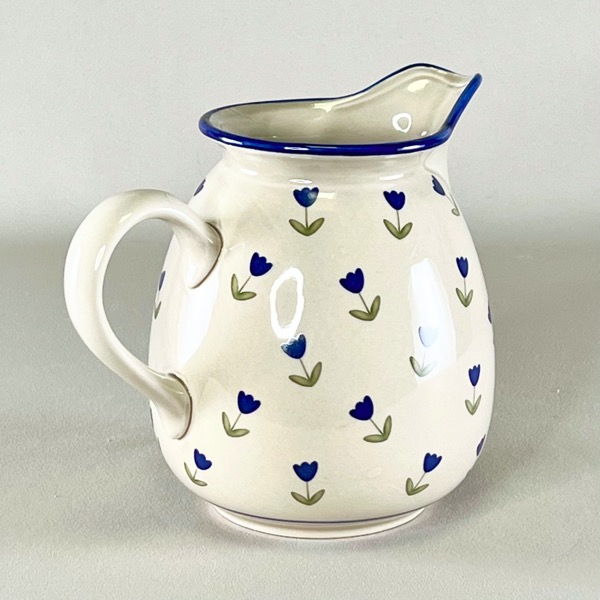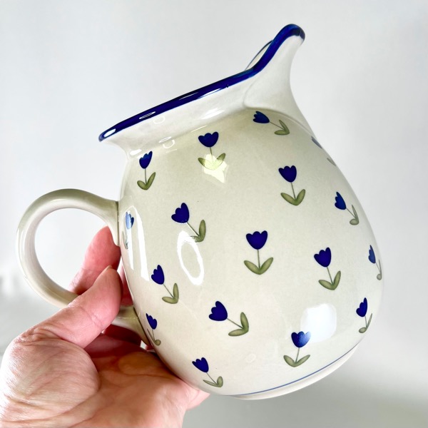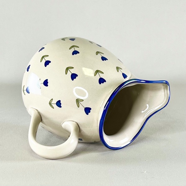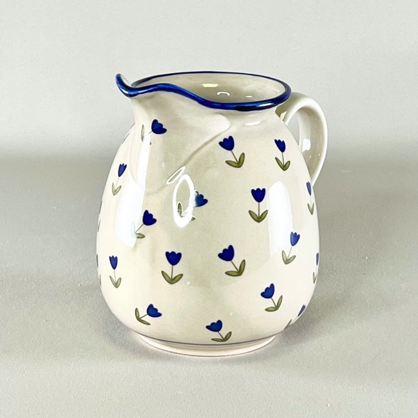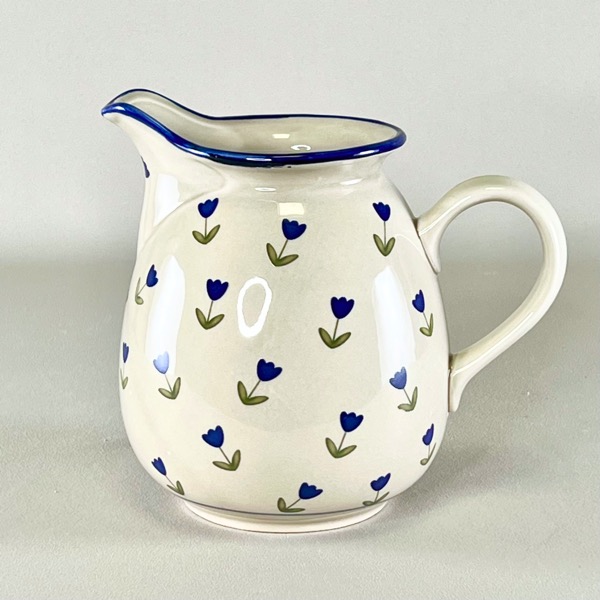 Rigtig flot mælkekande i off-white og med blå blomster.