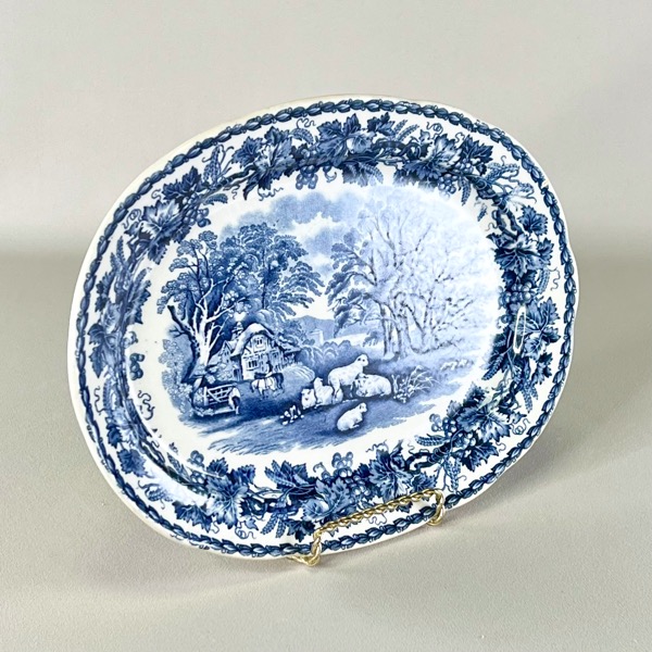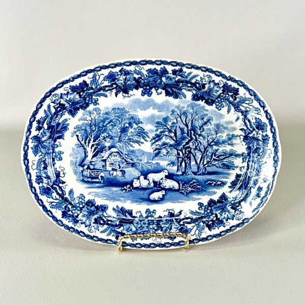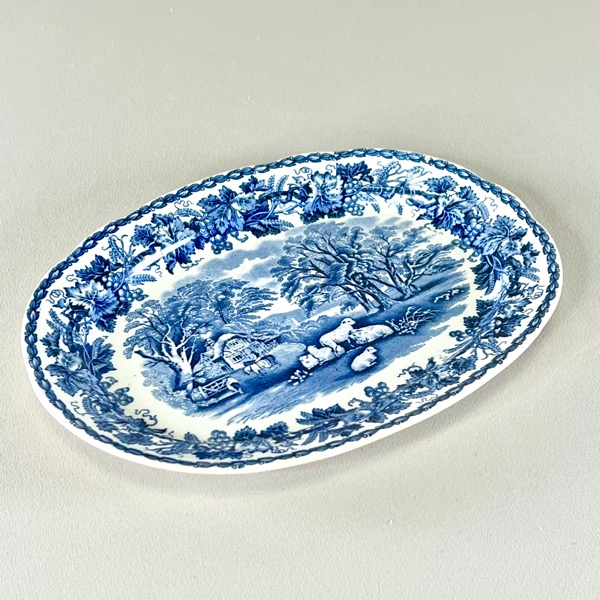 Charmerende mindre serveringsfad i engelsk porcelæn med håndmalet blåt motiv.