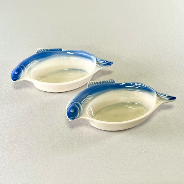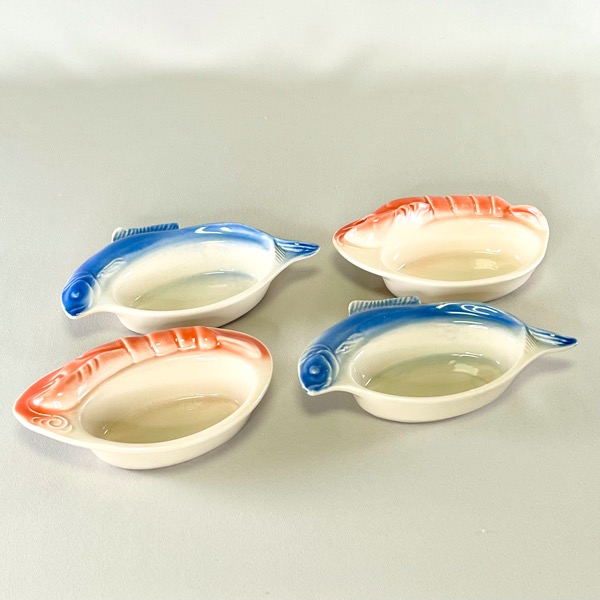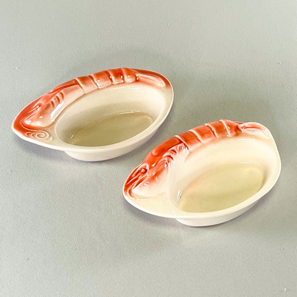Skønne små ildfaste skåle med fisk/hummer på siden.