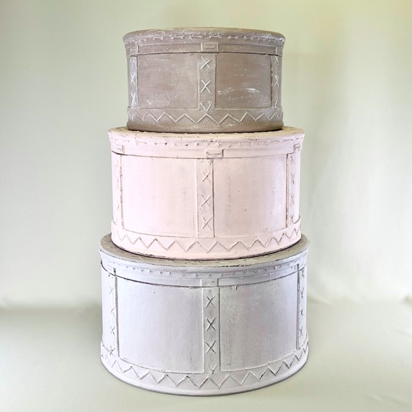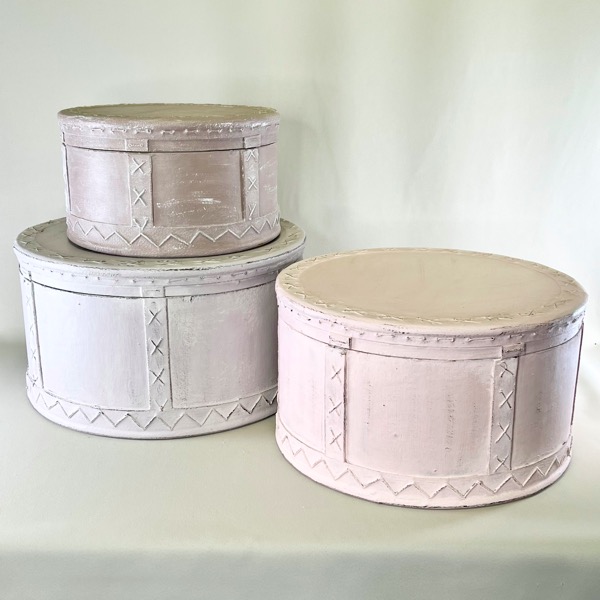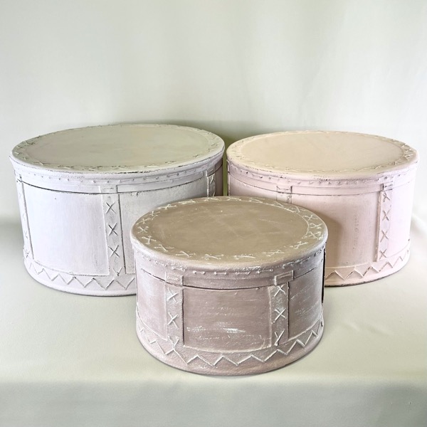 De er alle runde og udført i træ - og malet i tre forskellige matchende farver (sand, lyserød, brunlig) og efterbehandlet med voks.