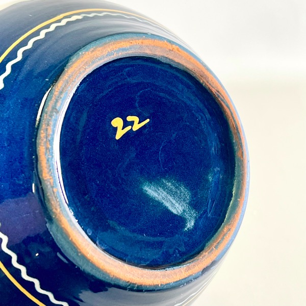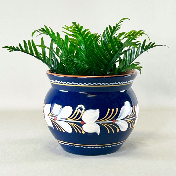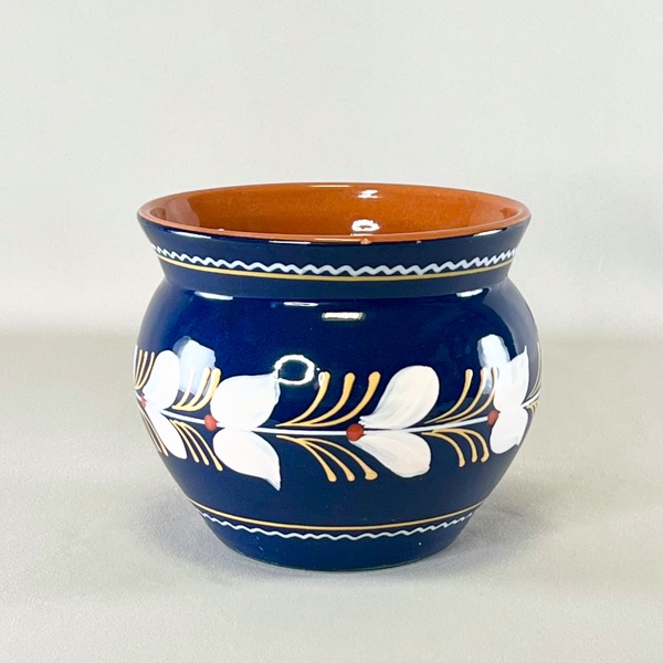 Stor keramik krukke med flot mønster med hvide blomster på blå baggrund. Krukken er brun indeni.