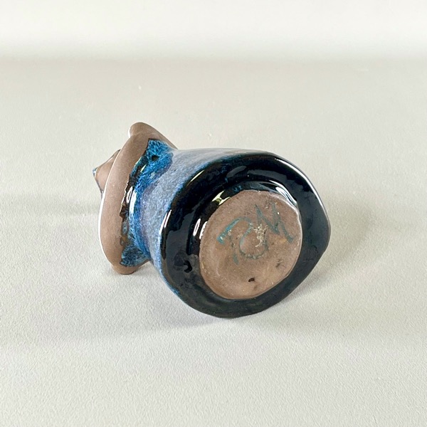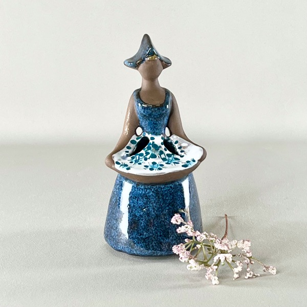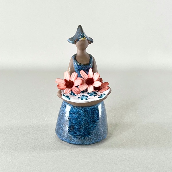 Pigens kjole og hat er i flot meleret blå glasur og forklædet er hvidt med blomster.