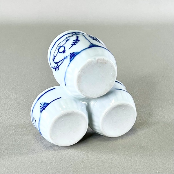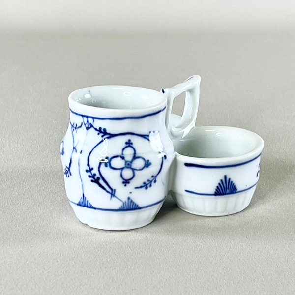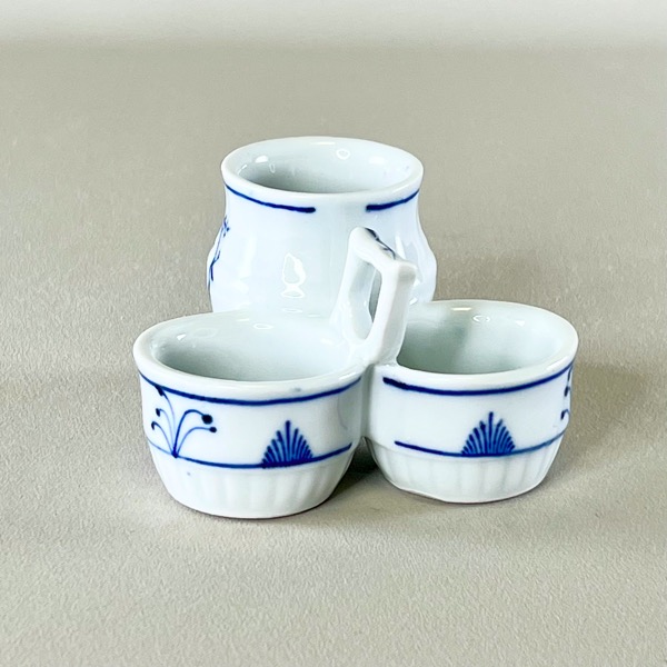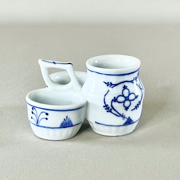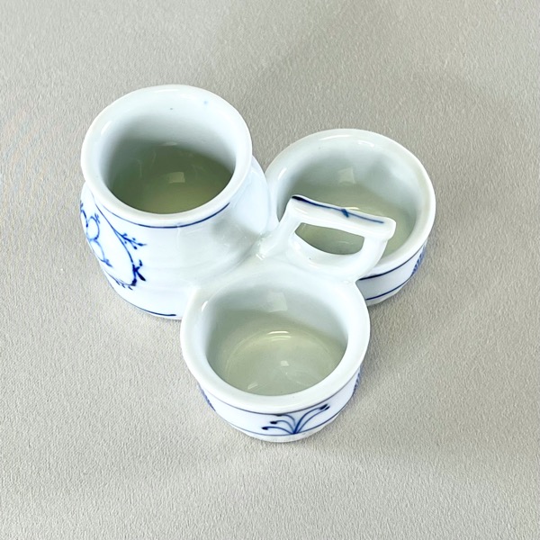 Flot vintage holder til salt + peber + sennep (eller måske tandstikkere) i fin musselmalet porcelæn - sikkert af tysk oprindelse.