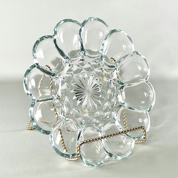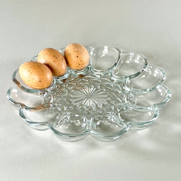 Fantastisk smukt vintage æggefad med plads til 12 æg og lidt tilbehør i midten.