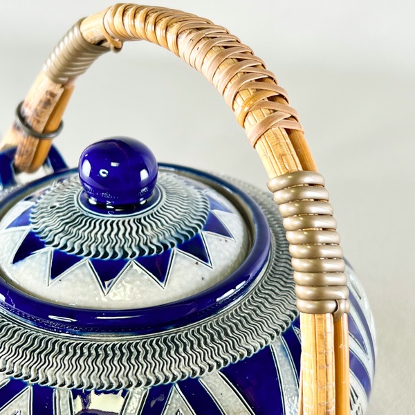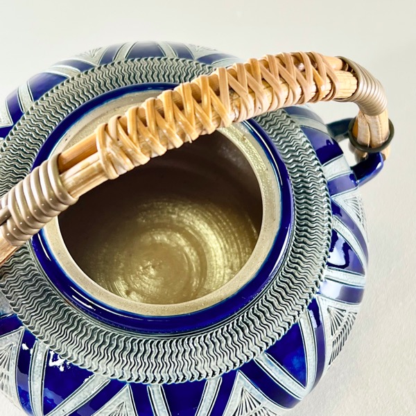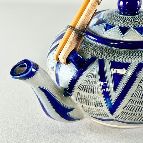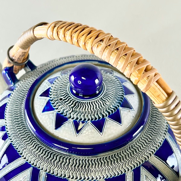 Detaljeret mønster i mørkeblå glasur. Tekanden er saltglaseret.