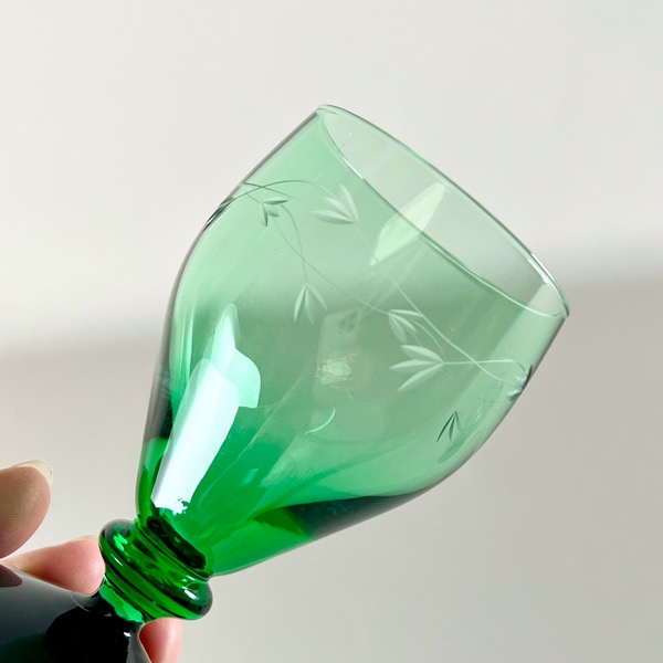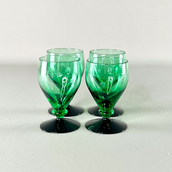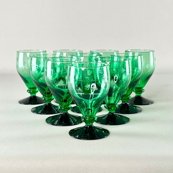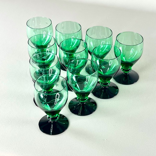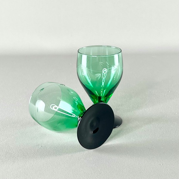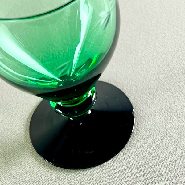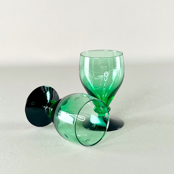 Smukke gamle Holmegaard hvidvinsglas med grøn kumme og sort fod. Serien hedder Ranke.