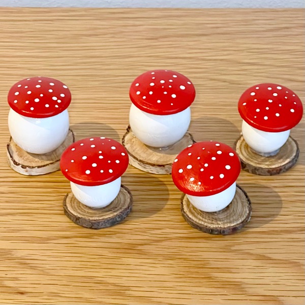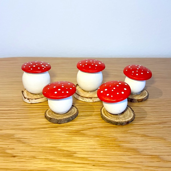 Kæreste små håndlavede rød fluesvamp. De er lavet i træ - enkle og dekorative på julebordet.