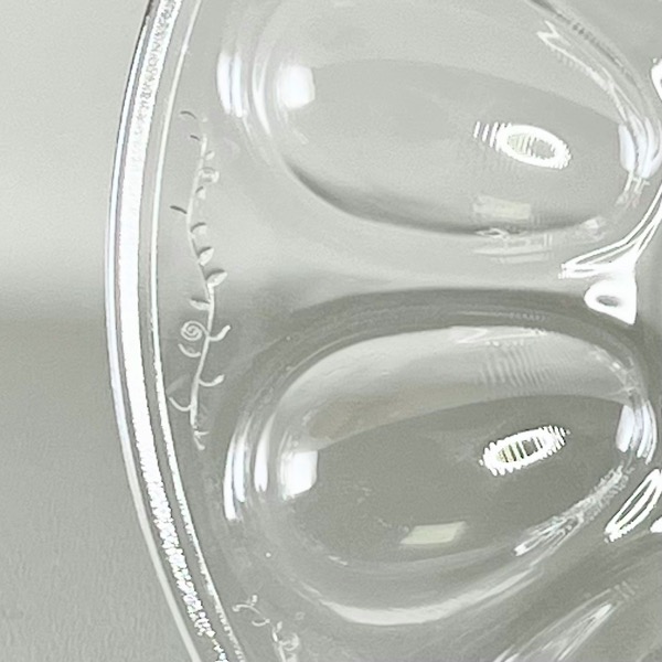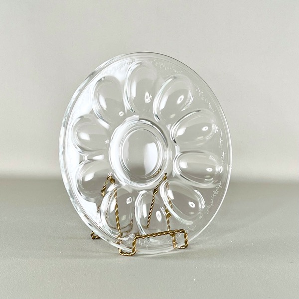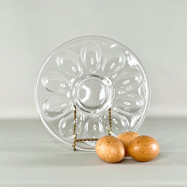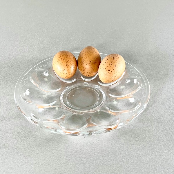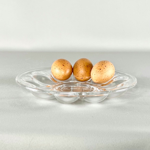 Flot æggefad i glas med plads til 10 æg og lidt pynt i midten.