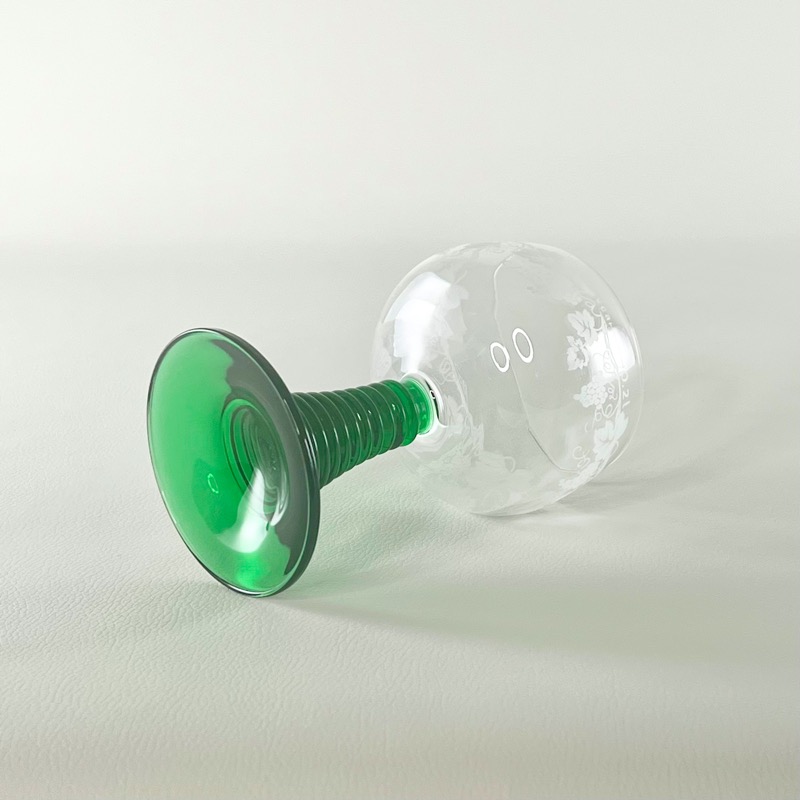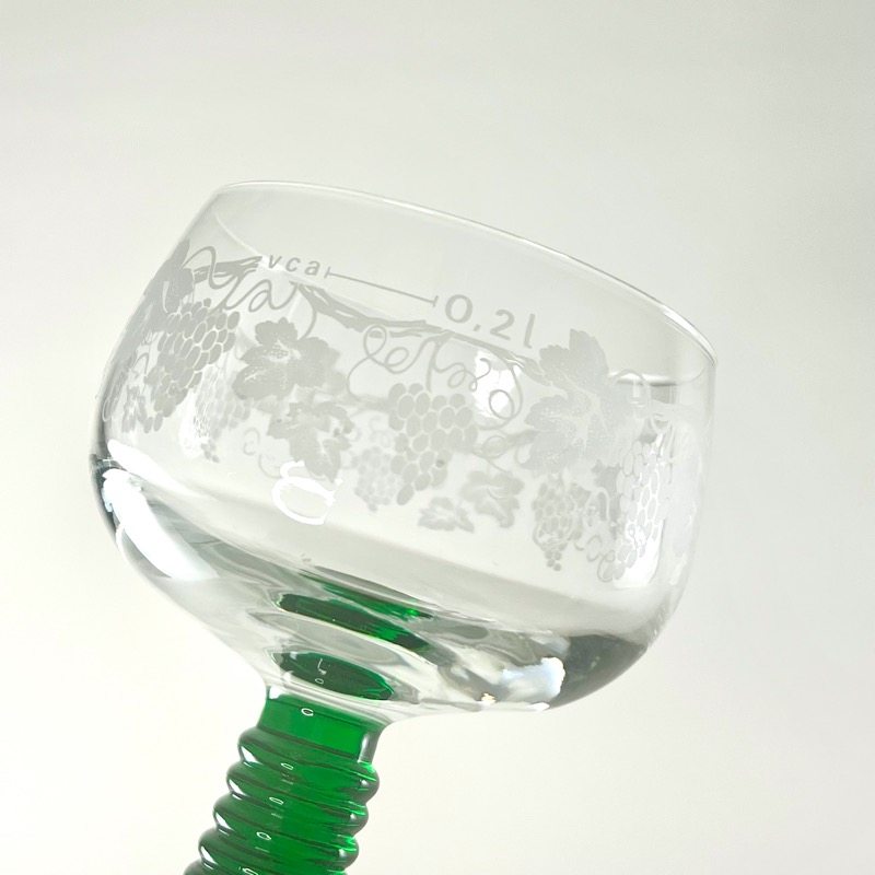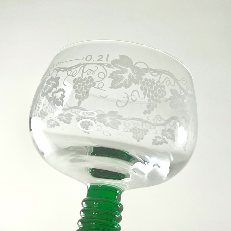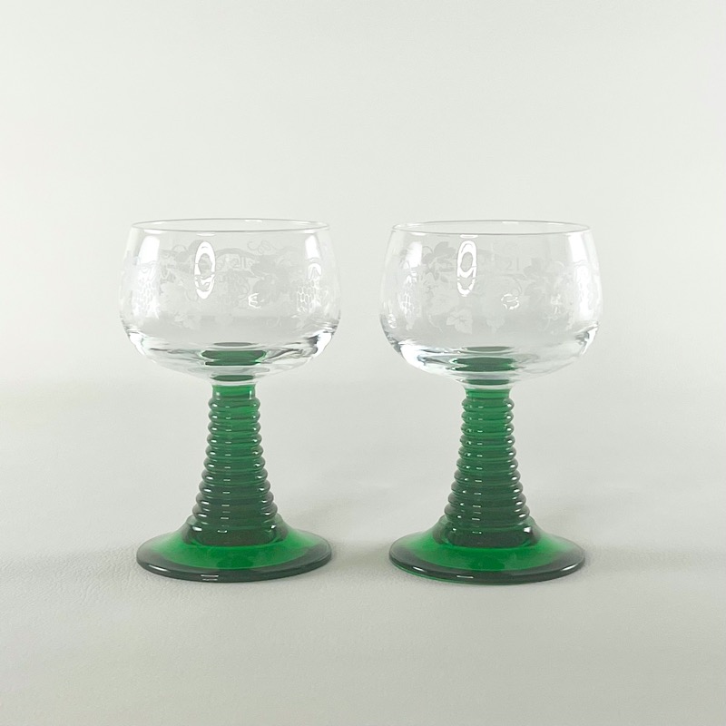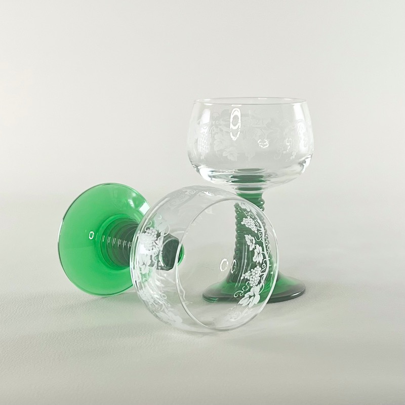 Smukke gamle Rømerglas på rillet klar flaskegrøn fod og med drueranker og vinløv på kummen.
