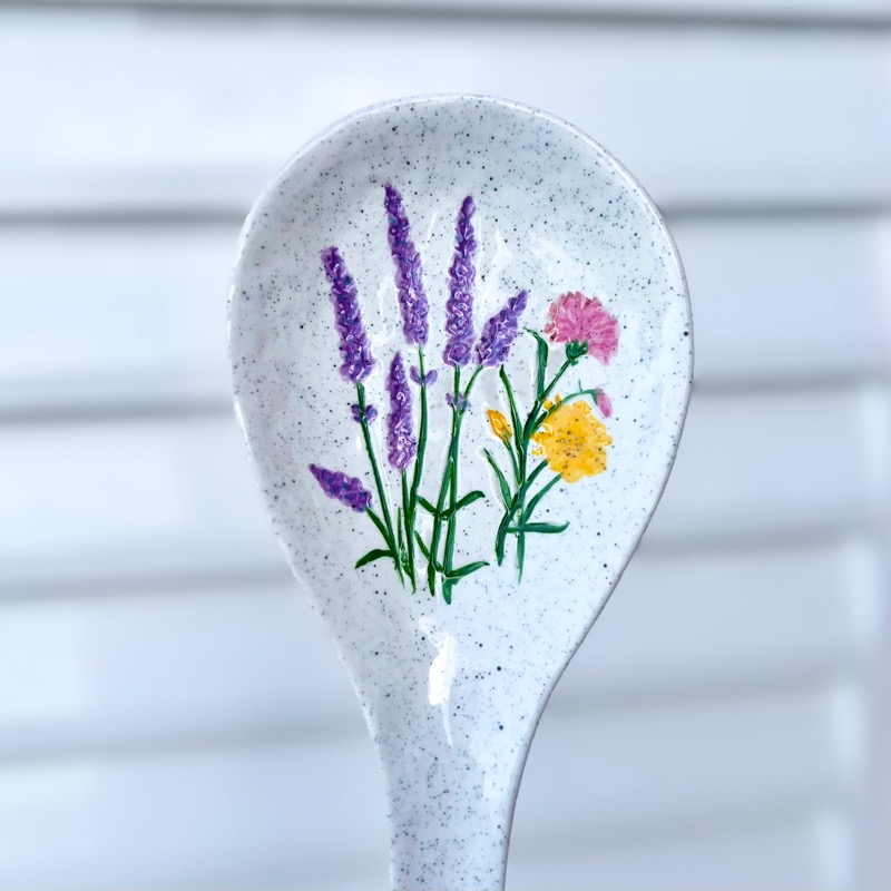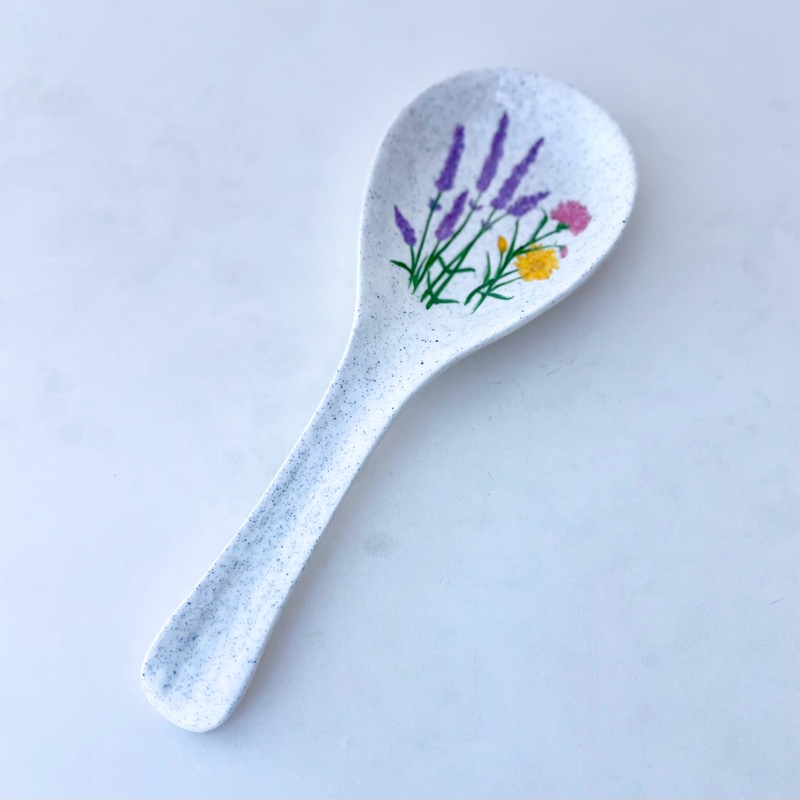 Stilfuld skestøtte i porcelæn med motiv af lavendler og vilde blomster.