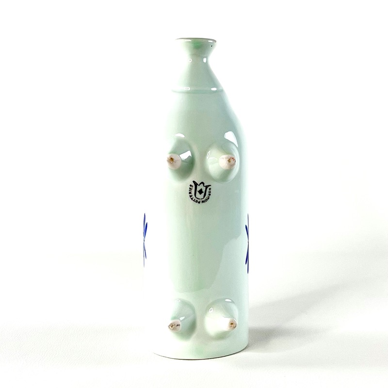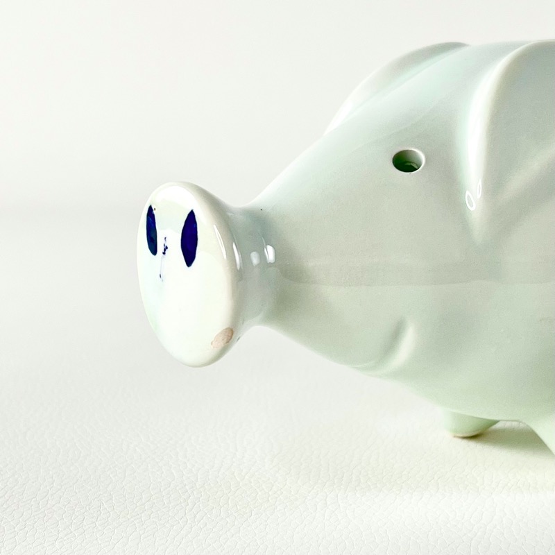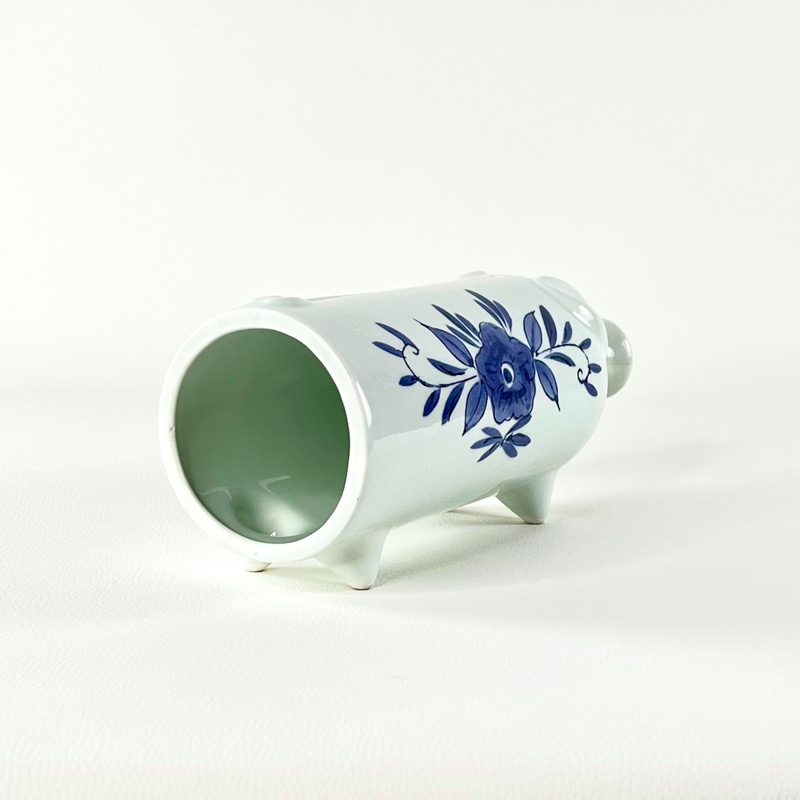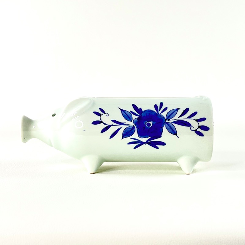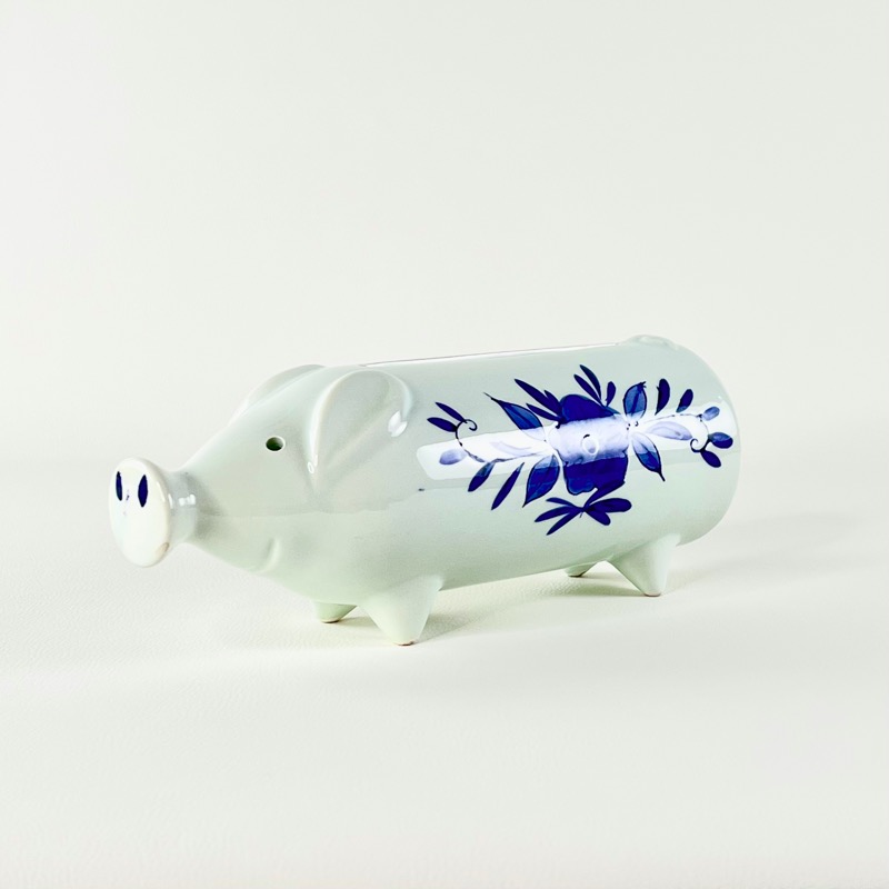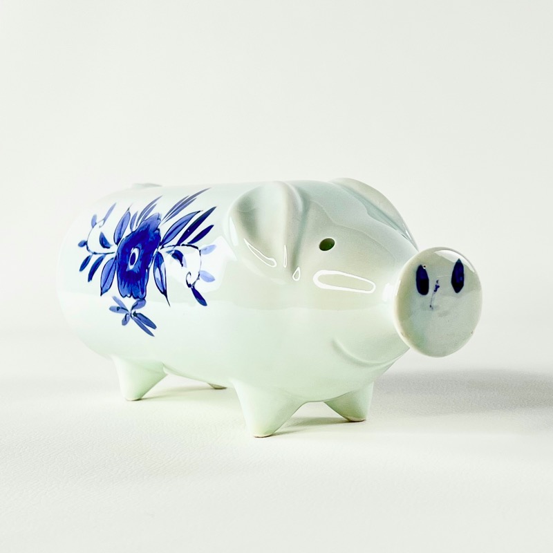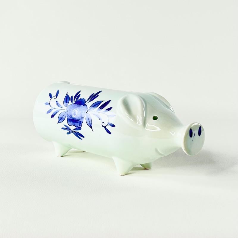 Skøn pølsegris i keramik med lyseblå glasur og blåt blomstermotiv - og en smilende mund, så bliver det da ikke meget bedre...