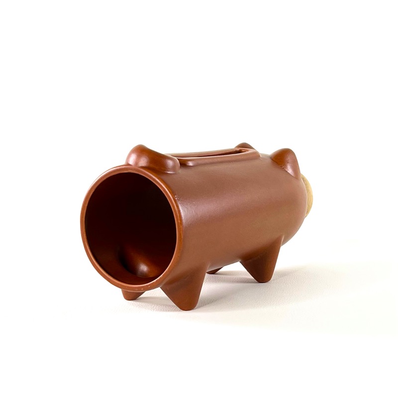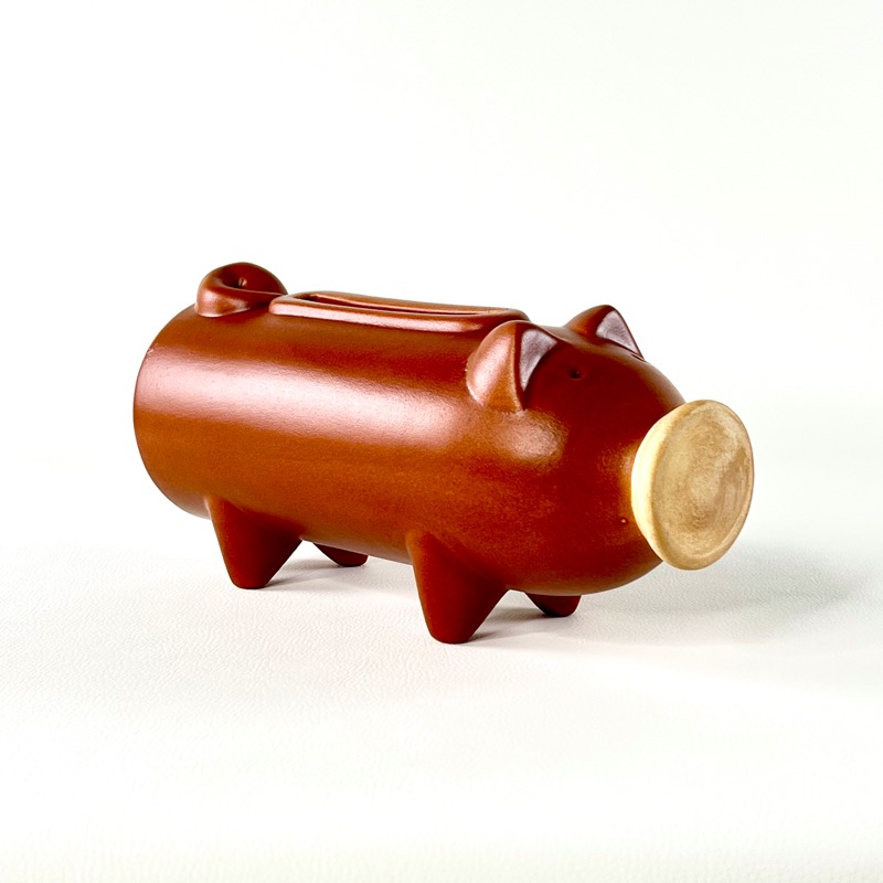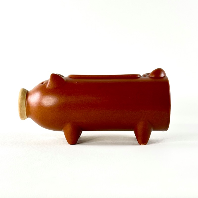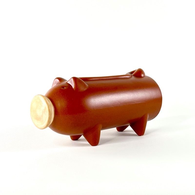 Sjov pølsegris i keramik med mat lysebrun glasur - og lys uglaseret snude.
