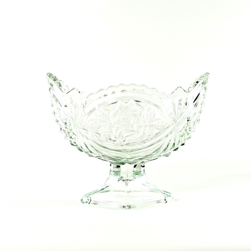 Smuk gammel jardiniere i presset glas med masser af smukt mønster og på fod.
