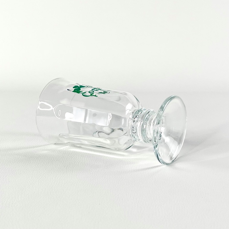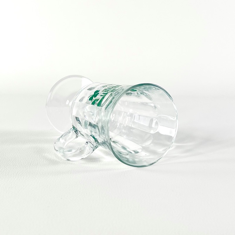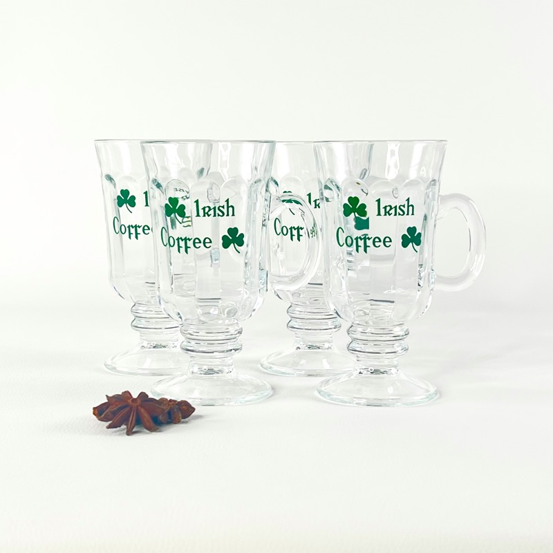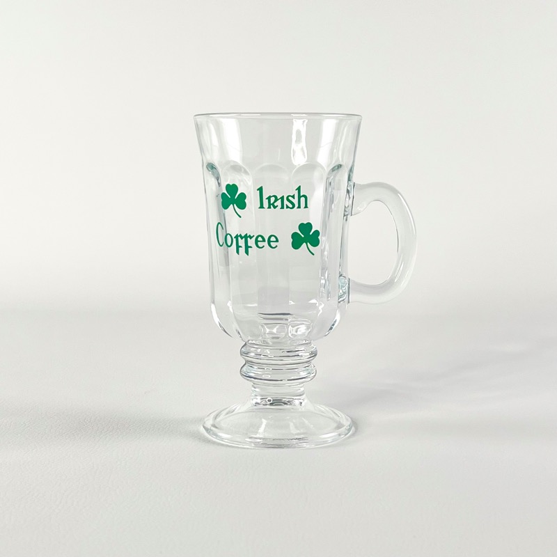 Retro glas til Irish Coffee - denne model er formet som et krus og har hank. Skriften er grøn.