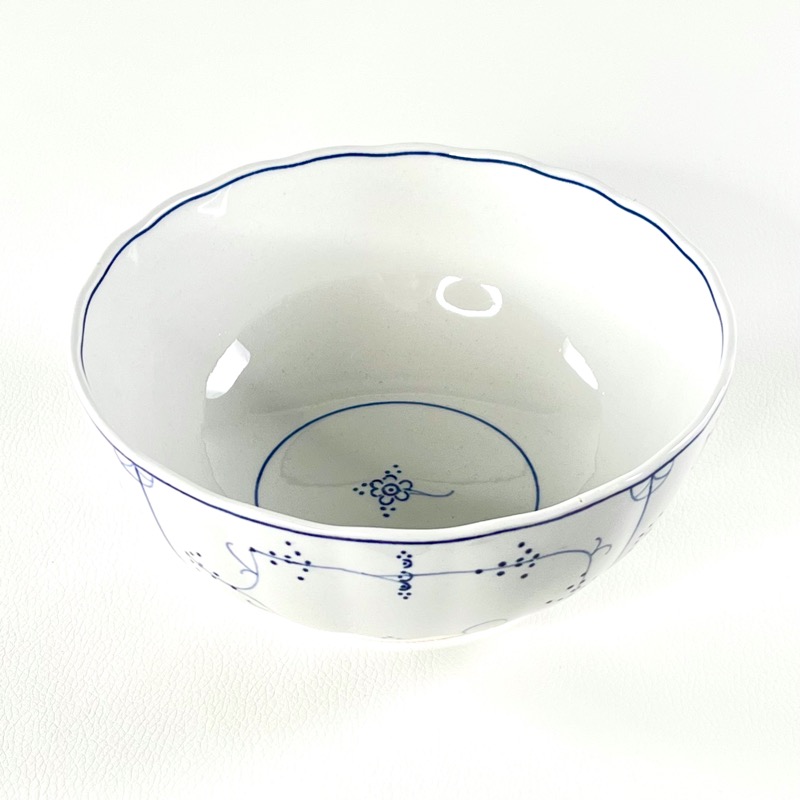 Lækker rund serveringsskål med let bølgende kant fra Villeroy & Boch. Hvid fajance med fint musselmalet blå streg.