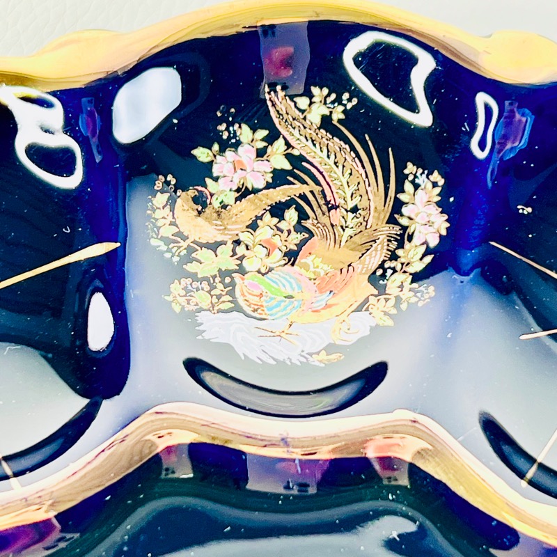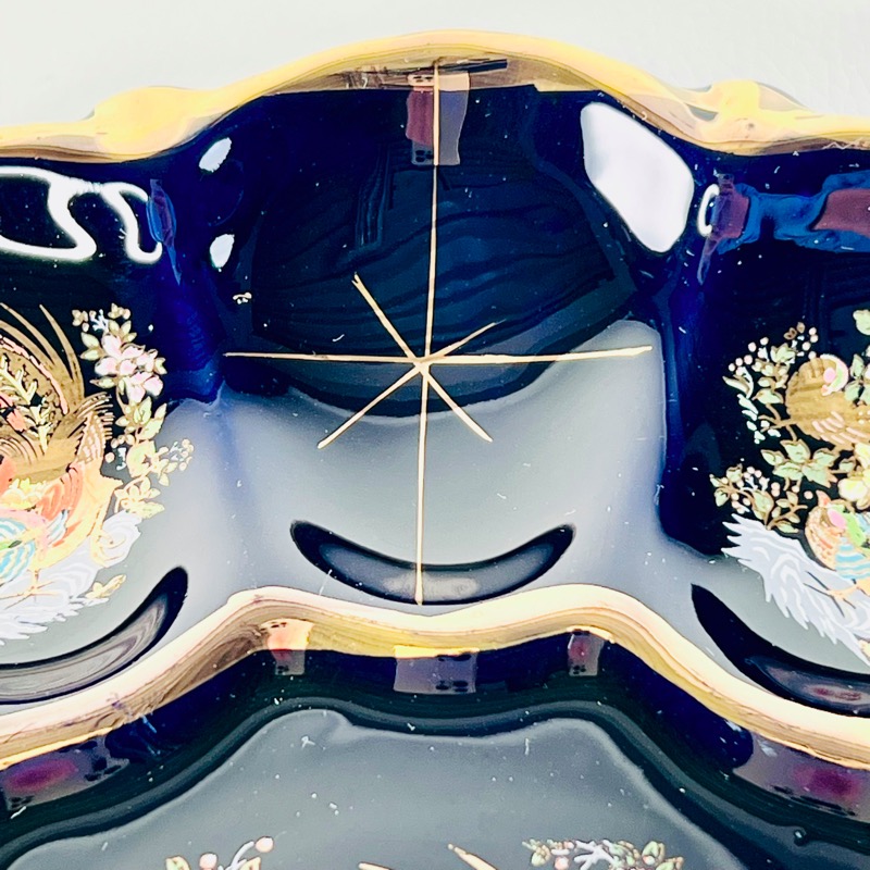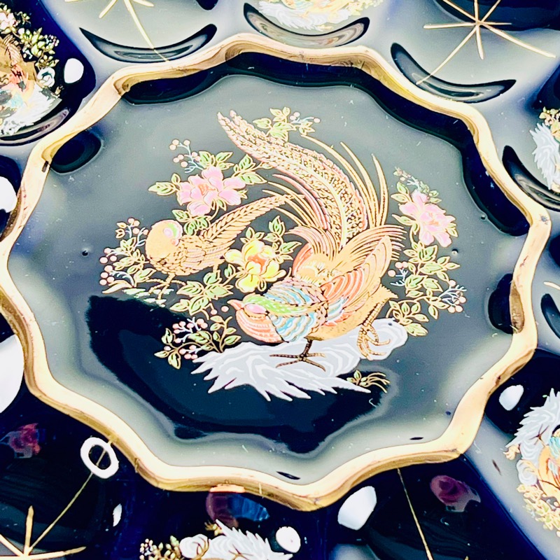 Glasuren er blåsort og der er dekoration med smukke fugle og gyldne stjerner.