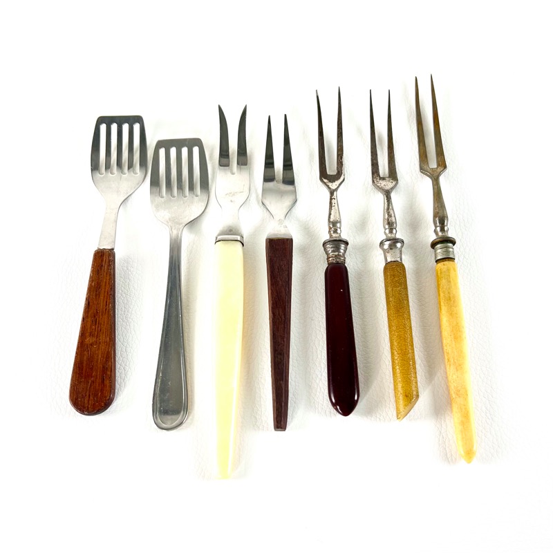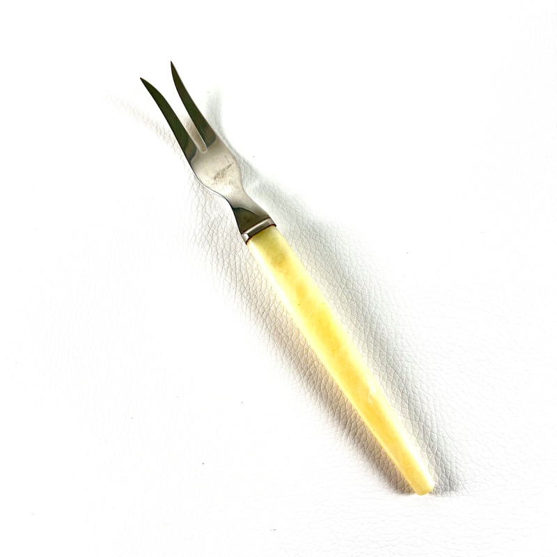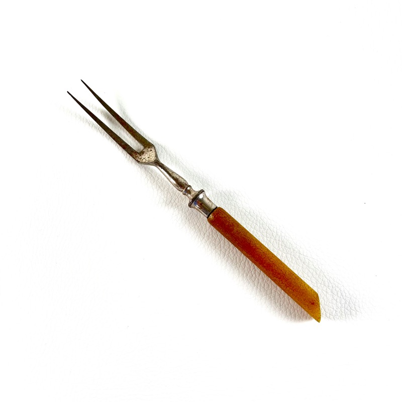 Nr. 6 - vintage pålægsgaffel med greb i hård plast. Mål ca. L17 cm.