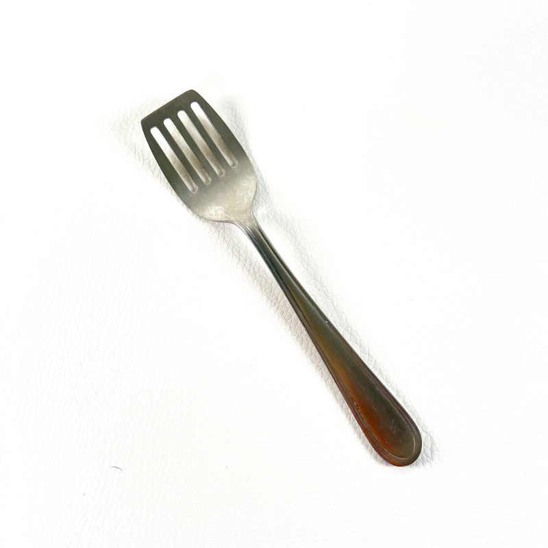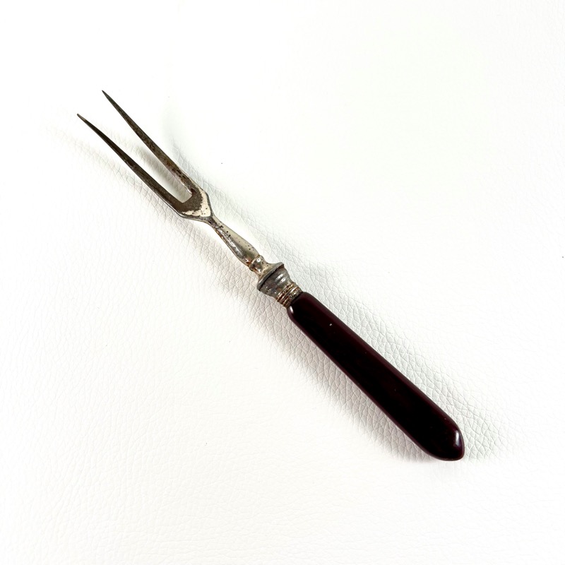 Nr. 5 - vintage pålægsgaffel med greb i hård mørkebrun plast. Mål ca. L17 cm.