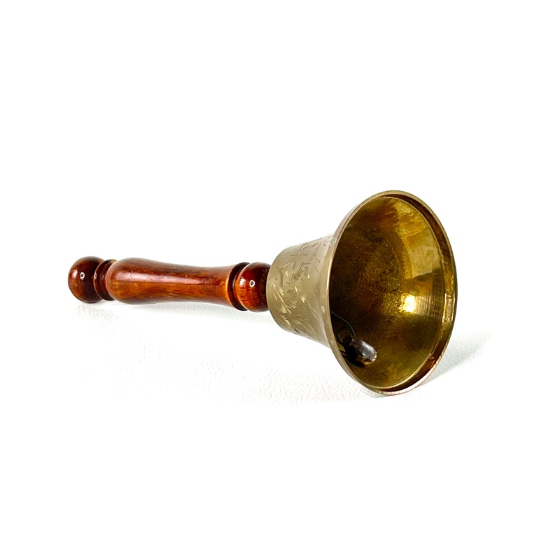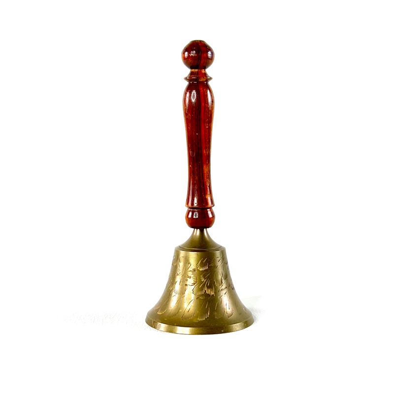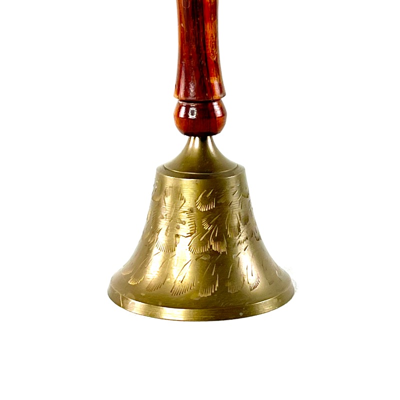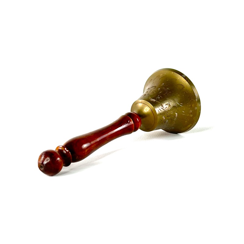 Fin gammel bordklokke i patineret messing med håndtag i træ. Selve klokken er dekoreret.