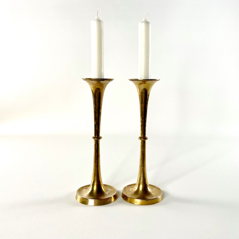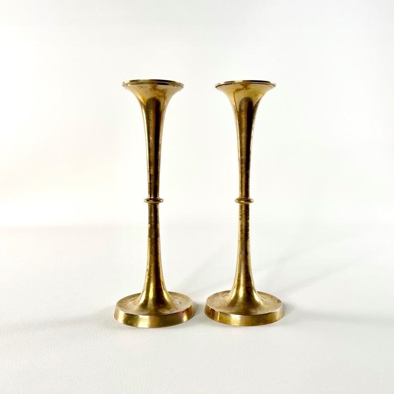 Et par flottte trompetformede lysestager i messing. Foden er let formet.