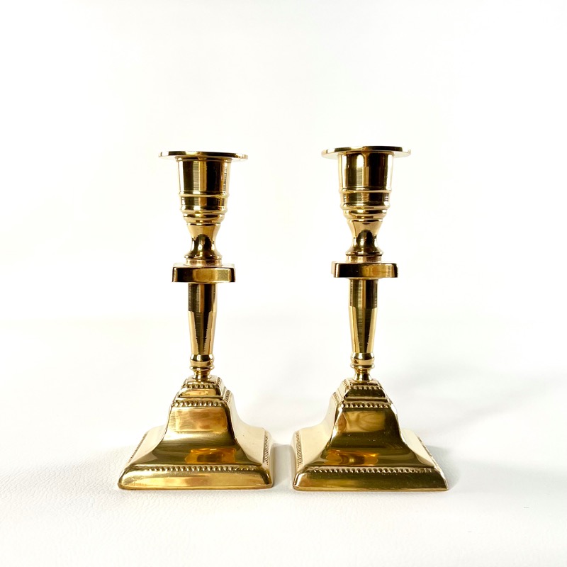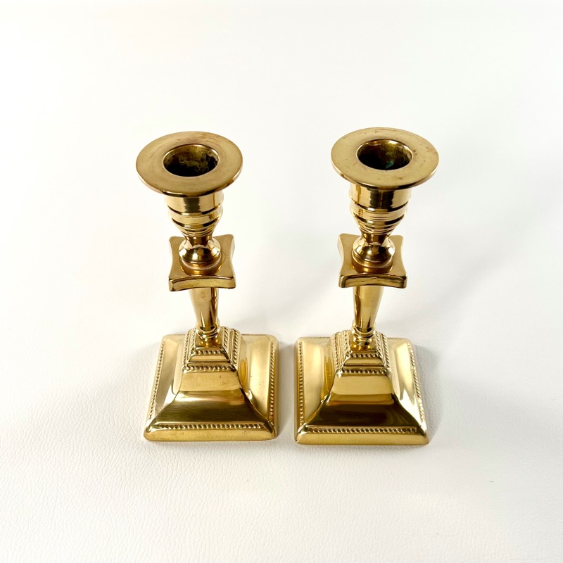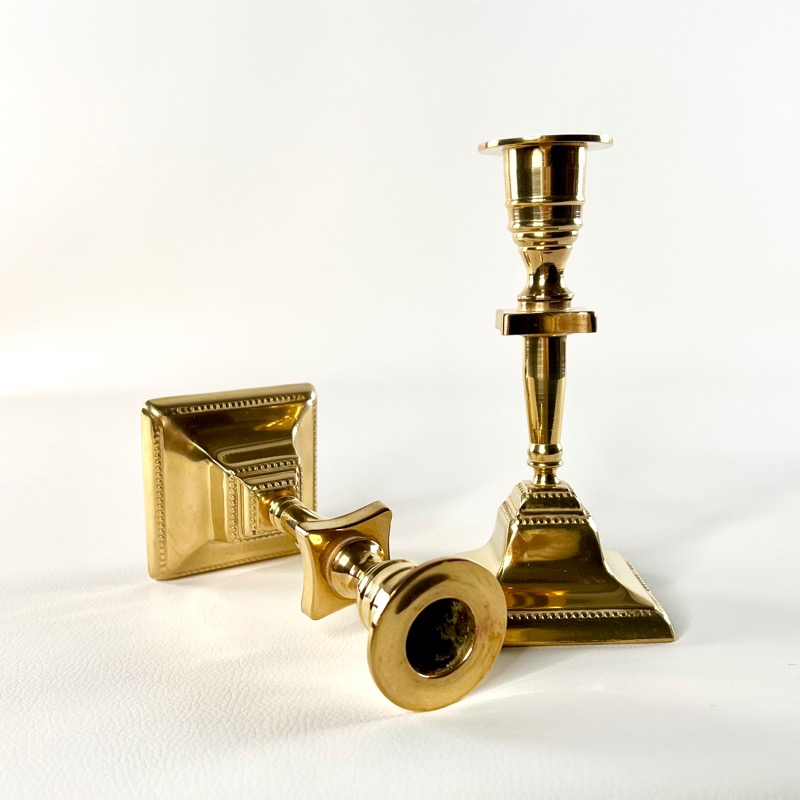 Smukt lysestage par i messing. Stagerne har firkantet fod med fint prikmønster.