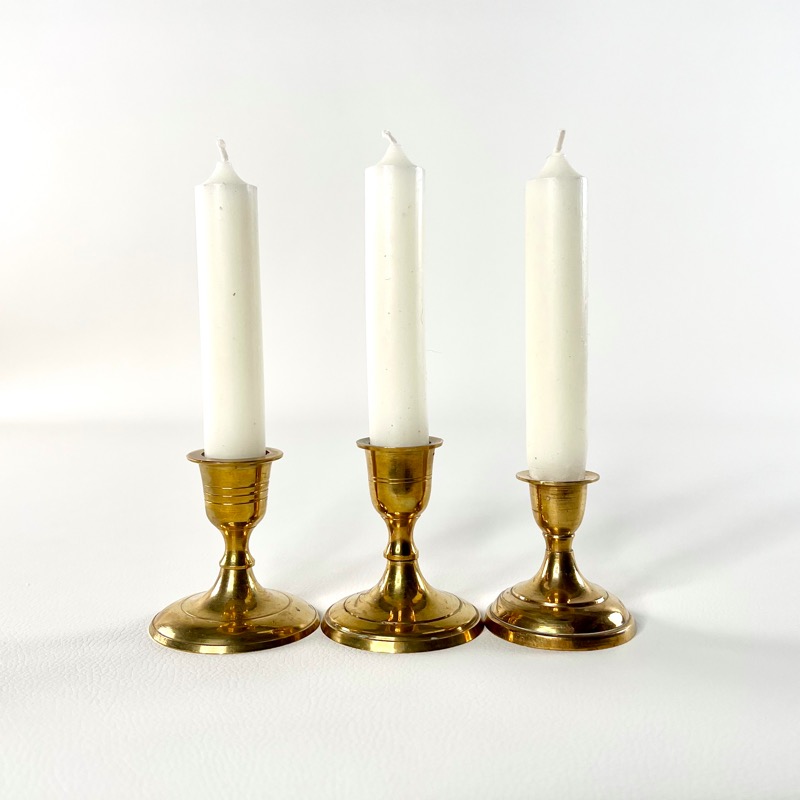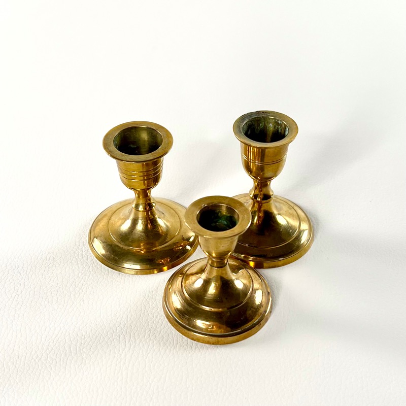Tre fine små lysestager i messing. De minder utrolig meget om hinanden, men er dog forskellige.