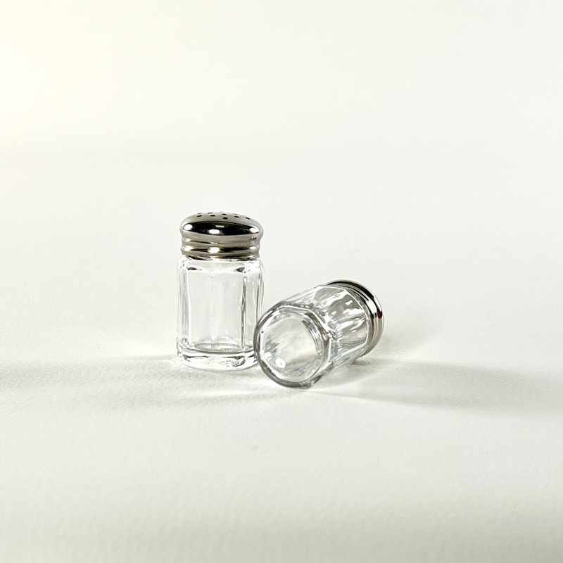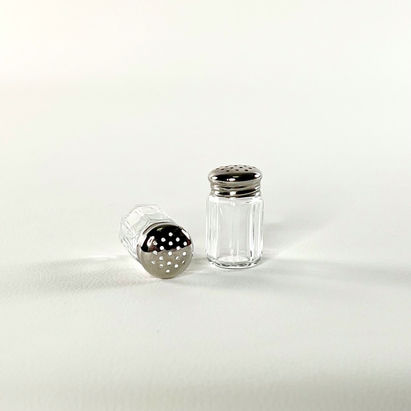 Fineste lille salt og peber-sæt i klart glas med metal top.