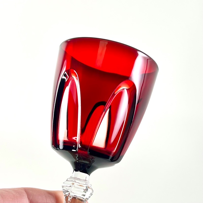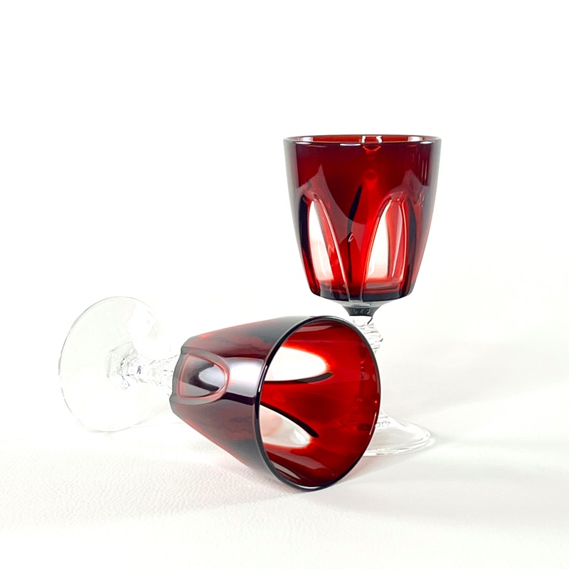 De har en smuk rubinrød fave og buer med klart glas. Flot formet stilk, som også er i klar glas.