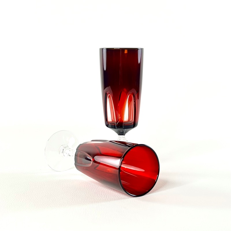 Glassene har en smuk rubinrød fave og buer med klart glas. Flot formet stilk, som også er i klar glas.