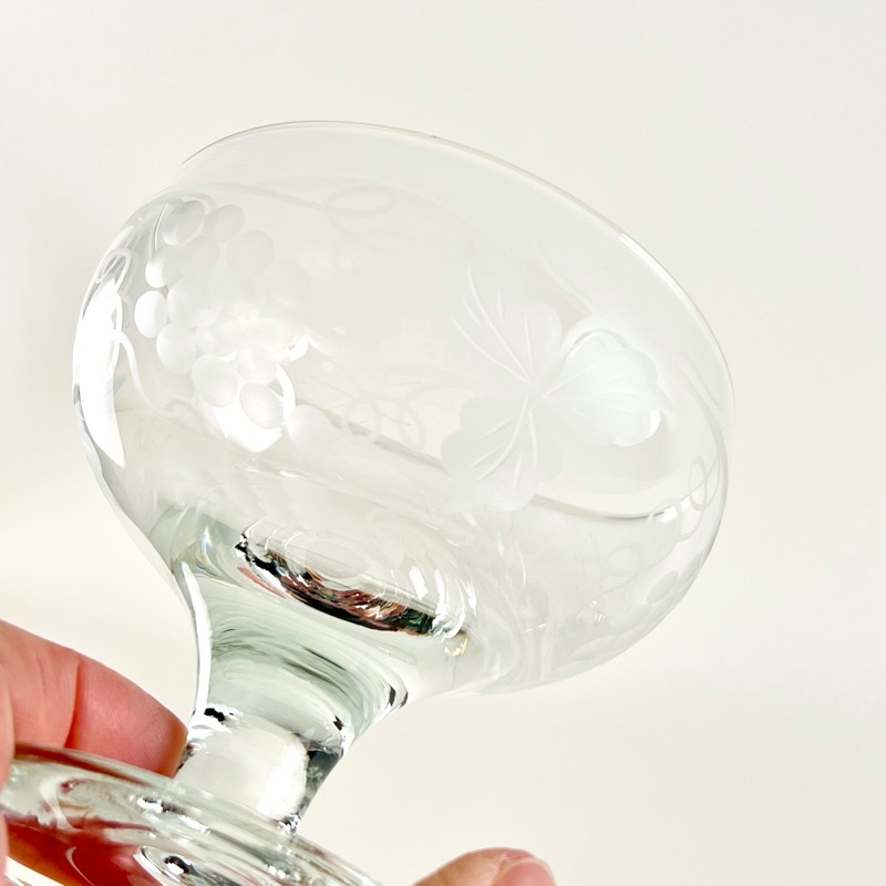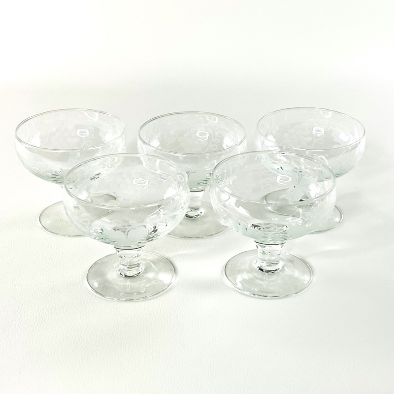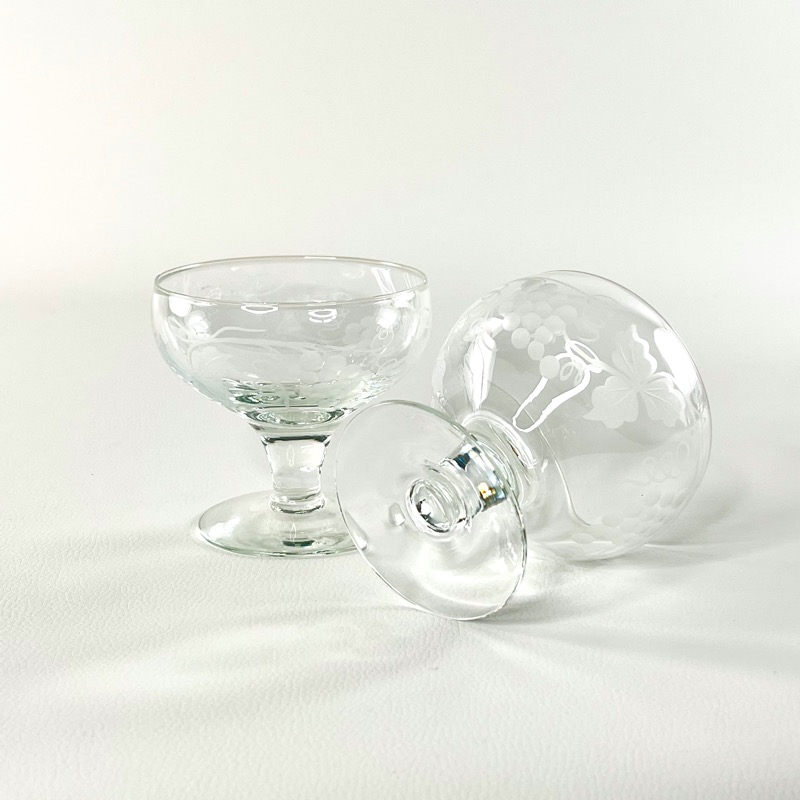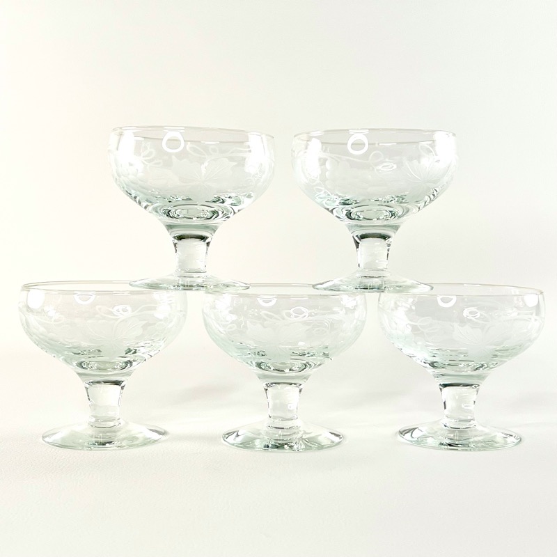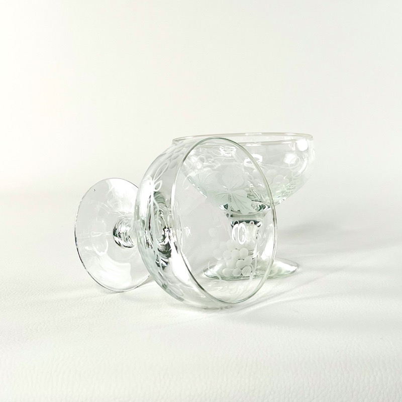 Smukke vintage champagneskåle flot dekorerede med vindrueranker.