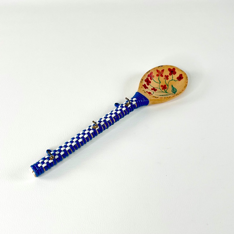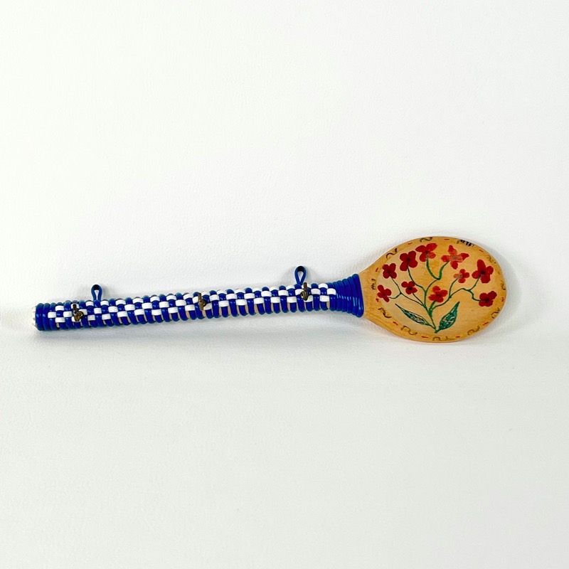 En grydeske i træ med plastbevikling og fine håndmalede blomster.