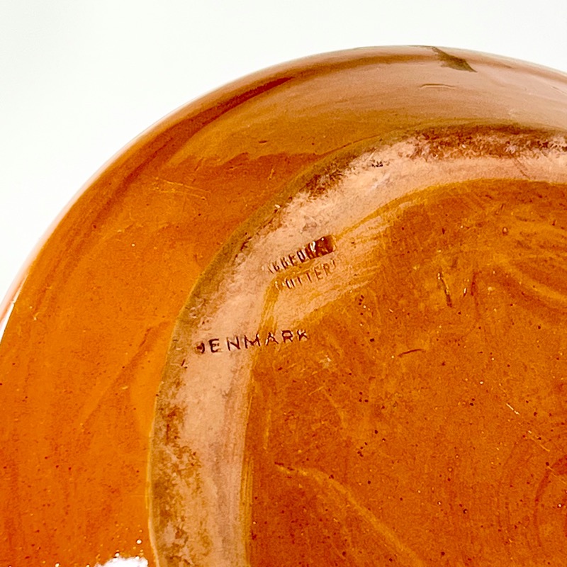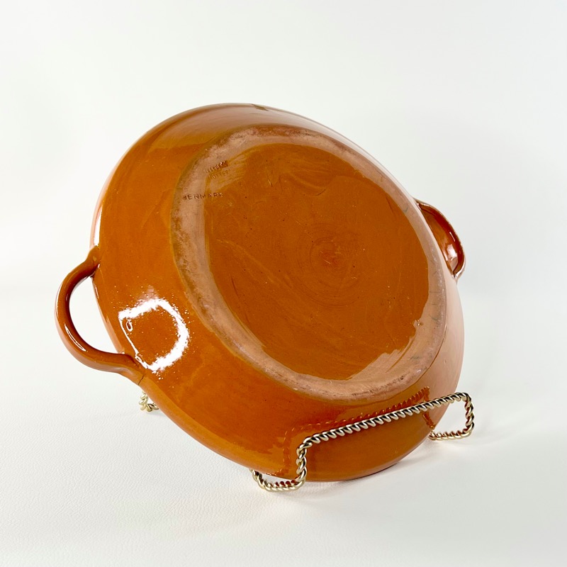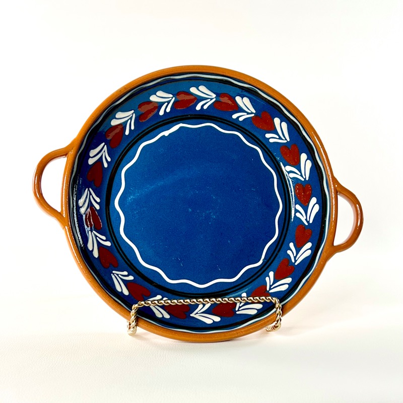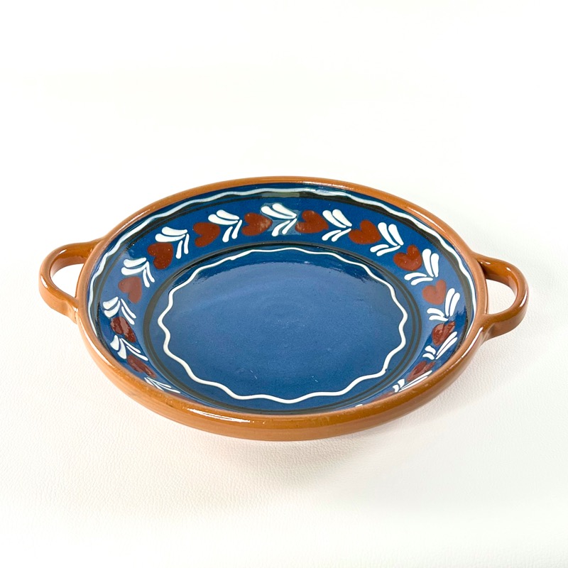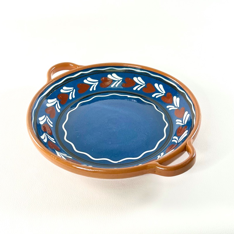 Skønt keramik fad med håndtag dekoreret med smuk glasur i almue blå farve.