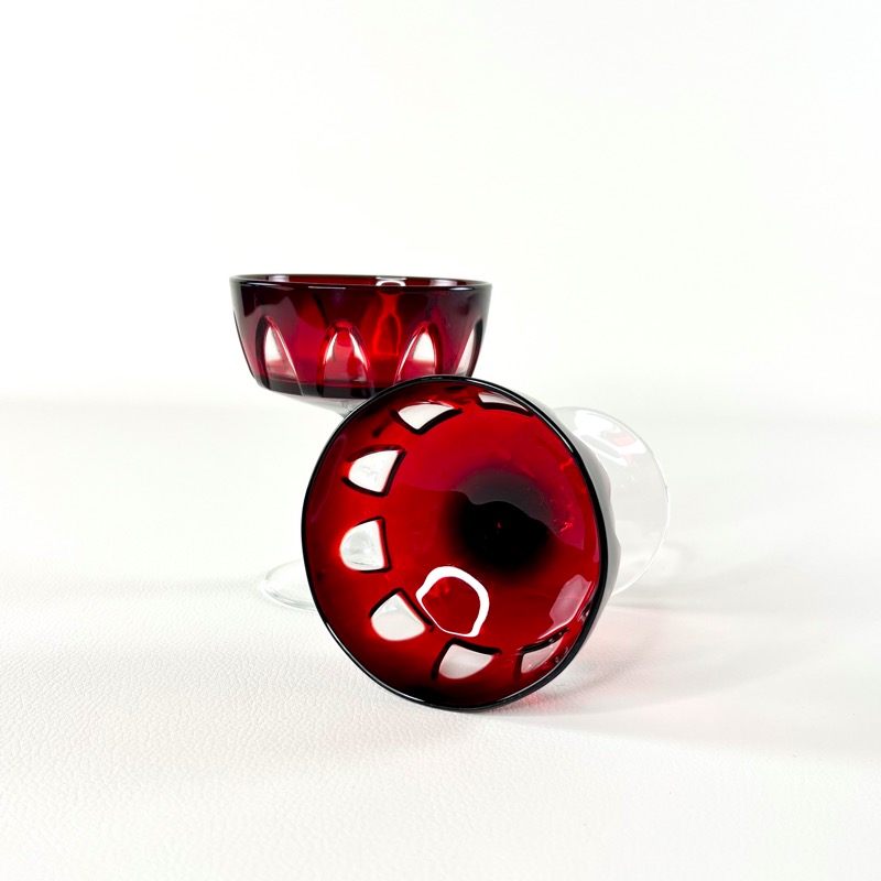 Glassene har en smuk rubinrød fave og buer med klart glas. Flot formet stilk, som også er i klar glas.