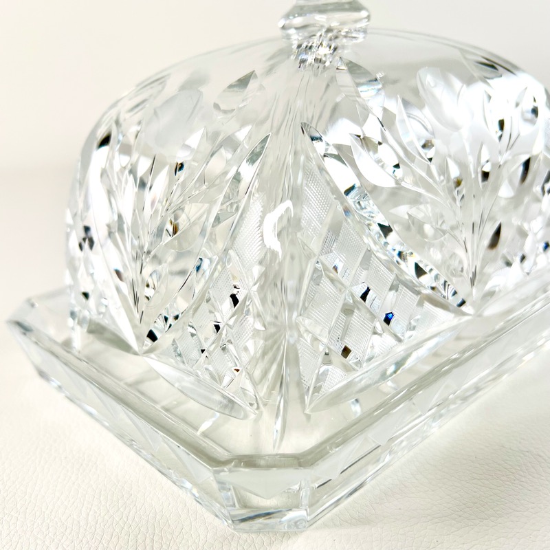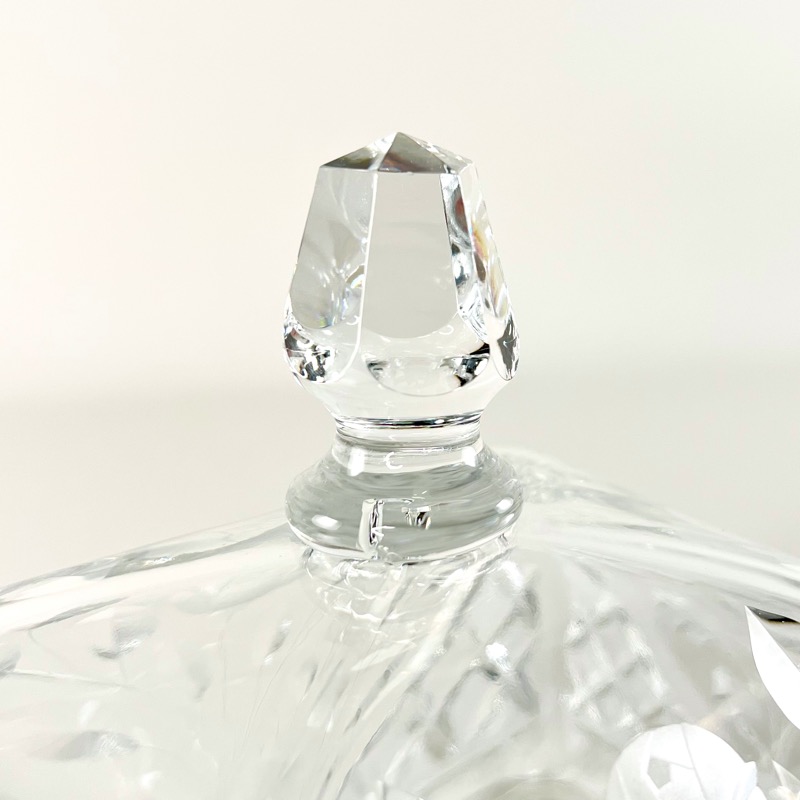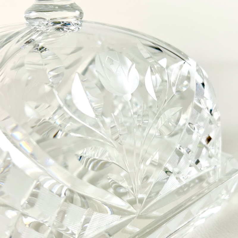 Utrolig smukt eksemplar i krystalglas med både diamantskåret og frostet mønster. Et helt lille kunstværk i sig selv.