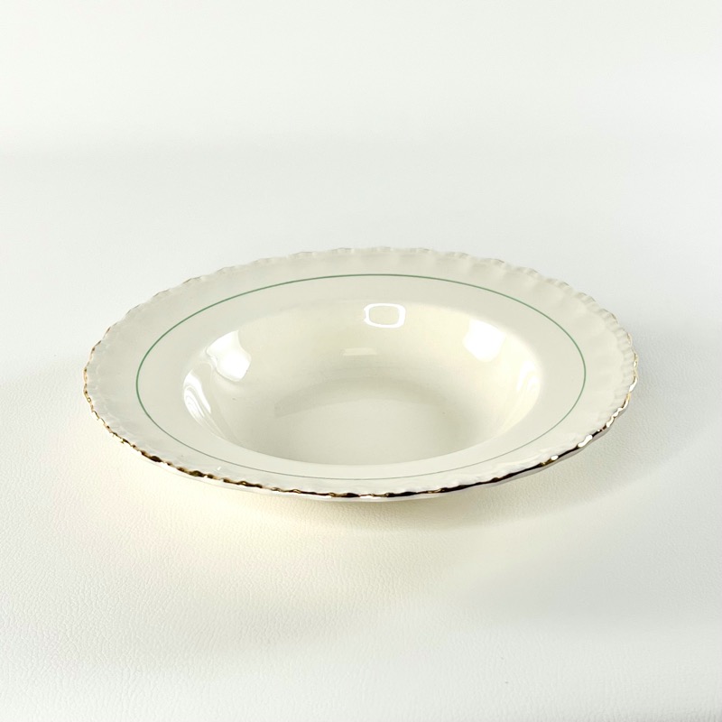 Skøn vintage dyb tallerken med sart grøn streg og blidt bølgende gylden kant.