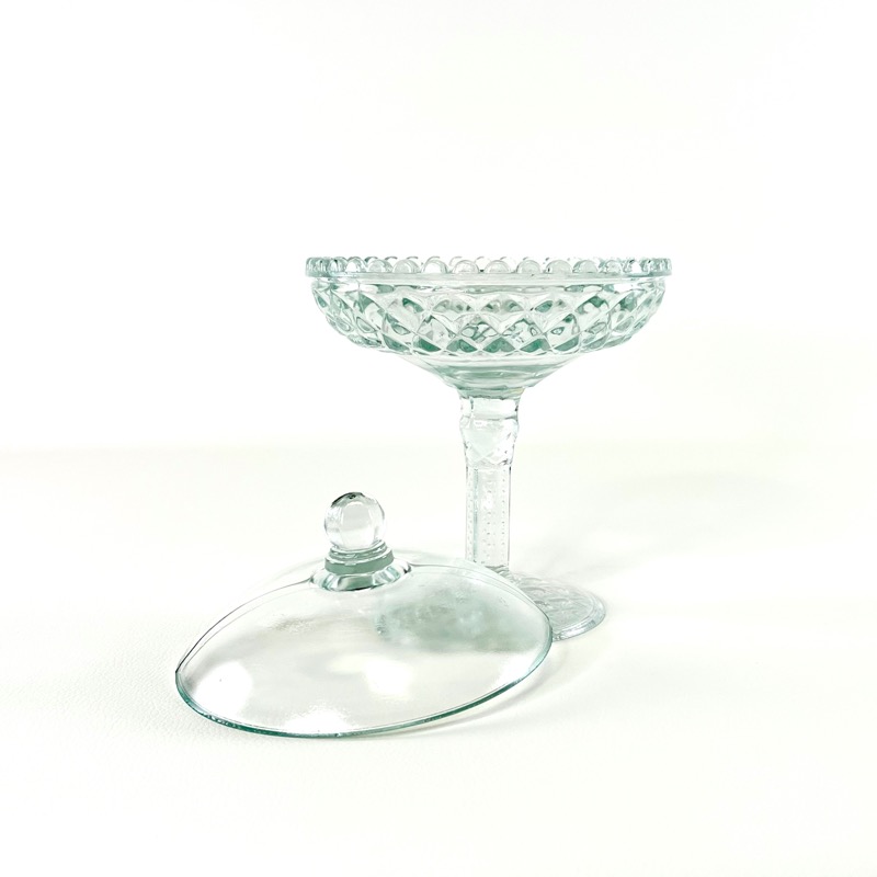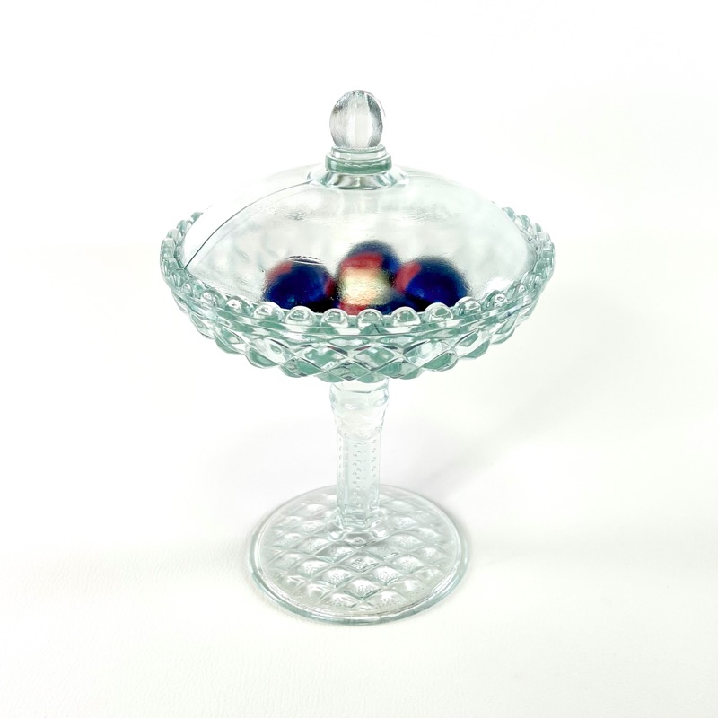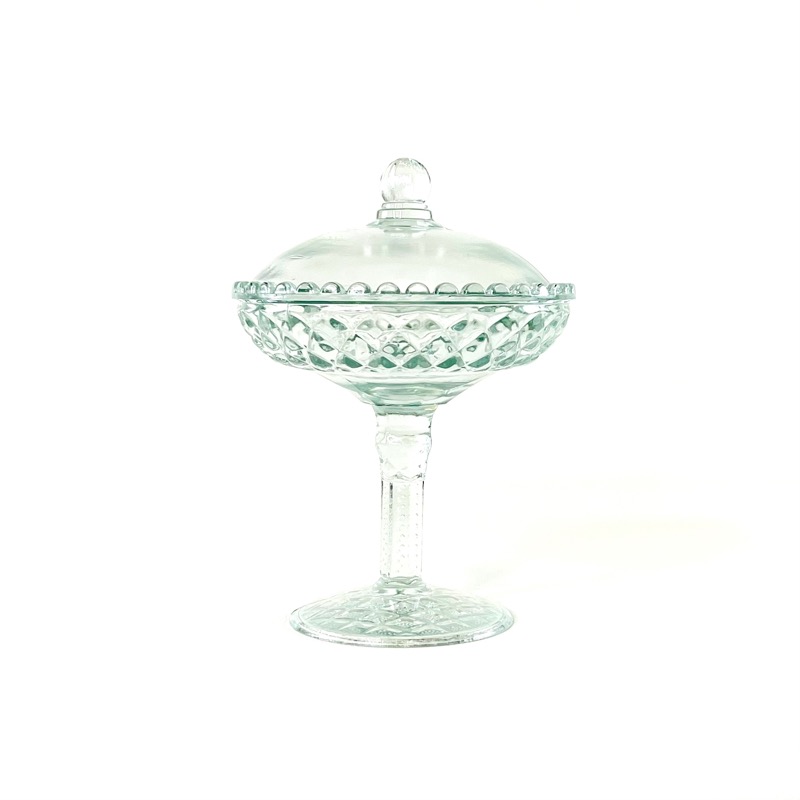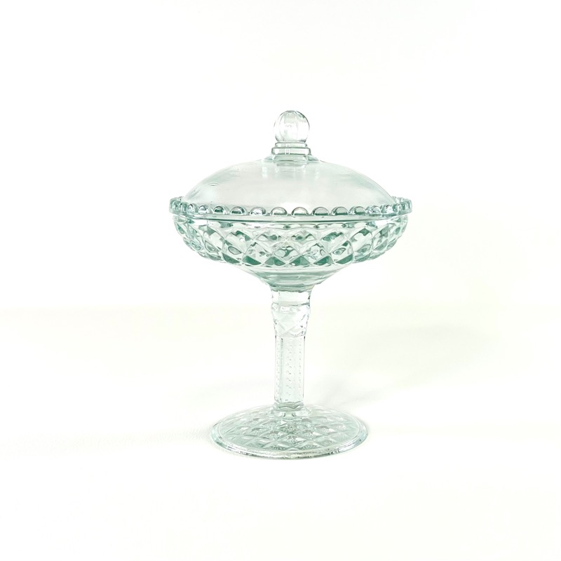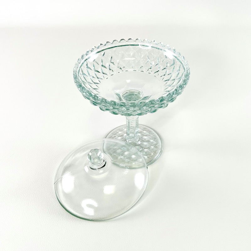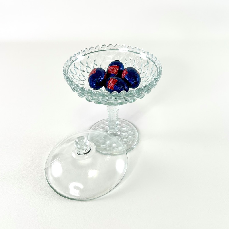 Flot lille glasopsats på høj fod og med tilhørende låg.