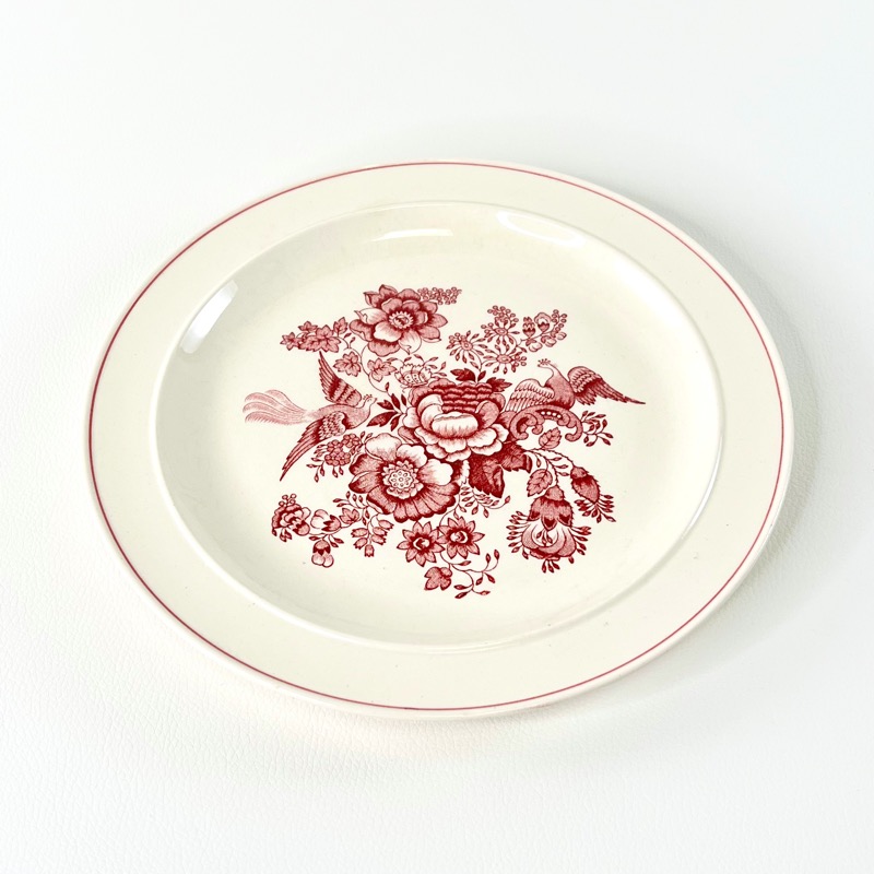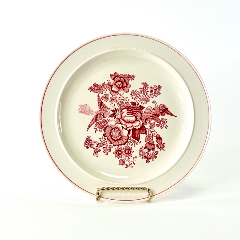Skøn vintage middagstallerken med flot rødt motiv af blomster og fasaner.