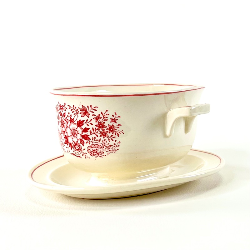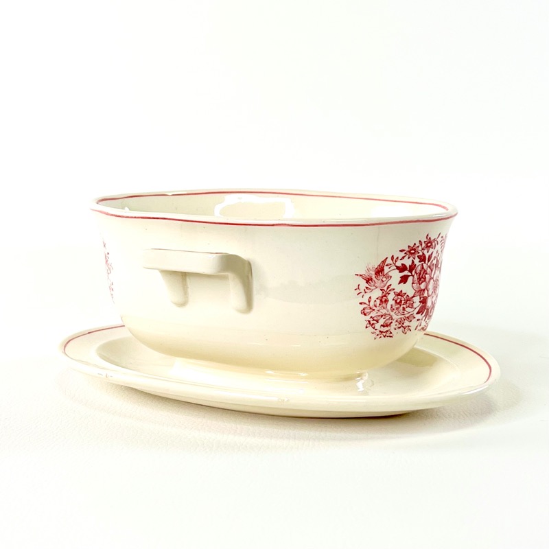 Skøn vintage sovsekande med flot rødt motiv af blomster og fasaner.