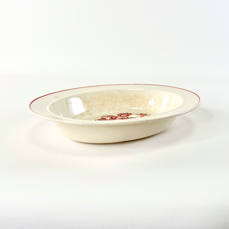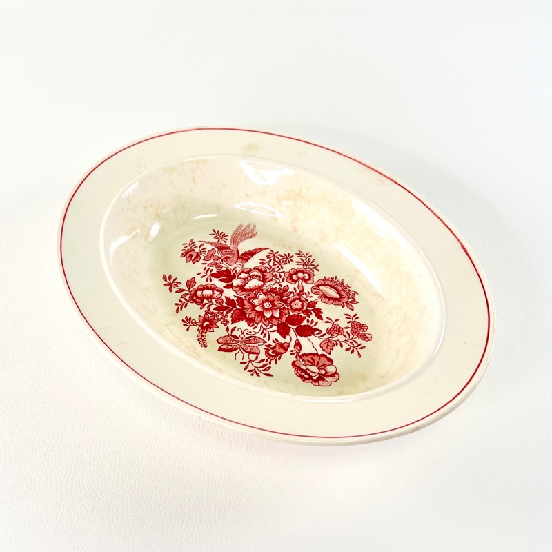 Skøn vintage oval serveringsskål med flot rødt motiv af blomster og fasaner.
