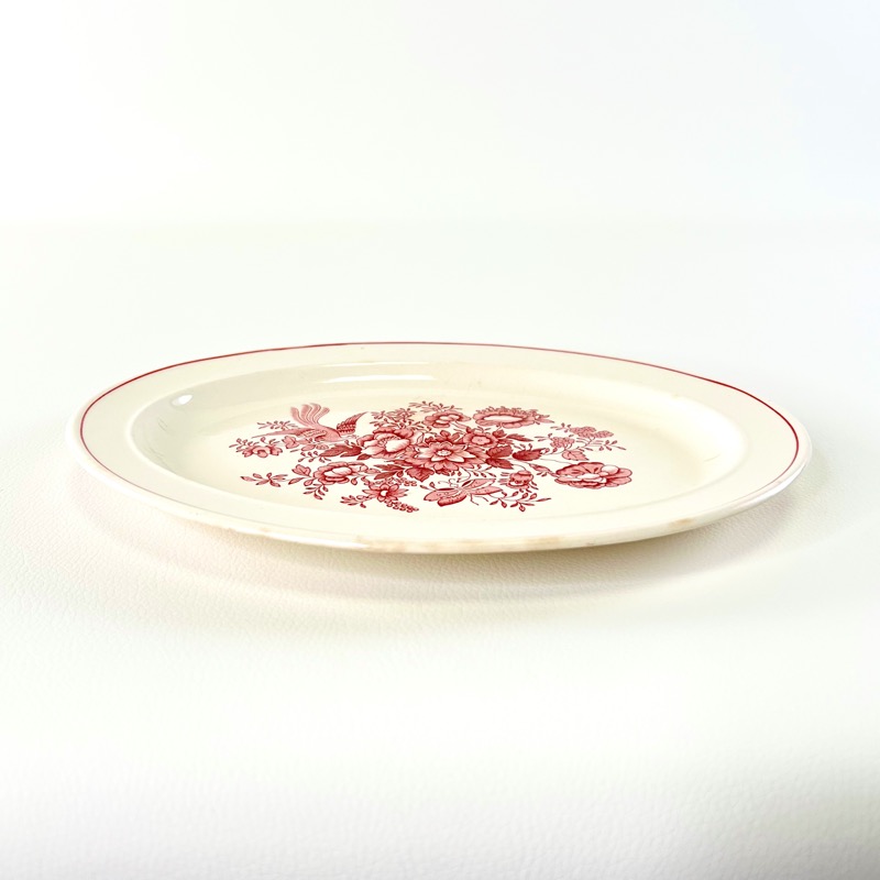 Skønt vintage ovatl serveringsfad i mellem størrelse med flot rødt motiv af blomster og fasaner.