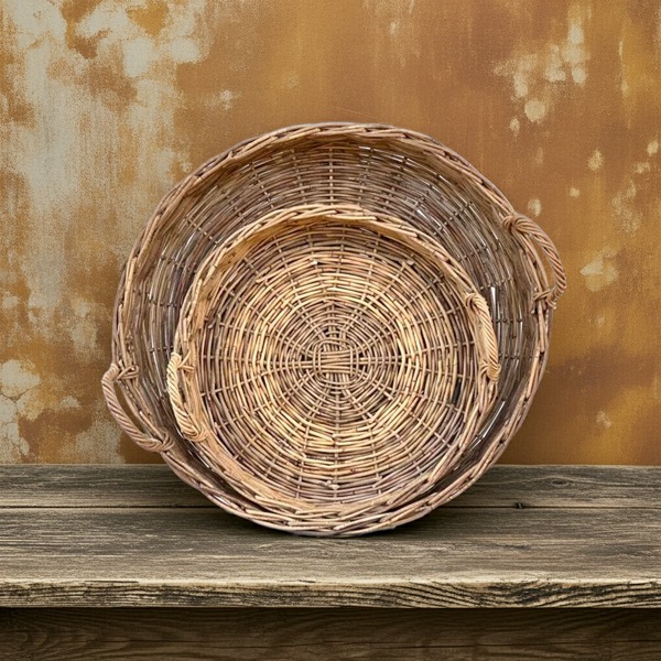 Et fantastisk kurvesæt bestående af to kurve. Super flotte på bordet, på gulvet, på væggen…… Stor ca. Ø80 x H15. Lille ca. Ø60 x H12.