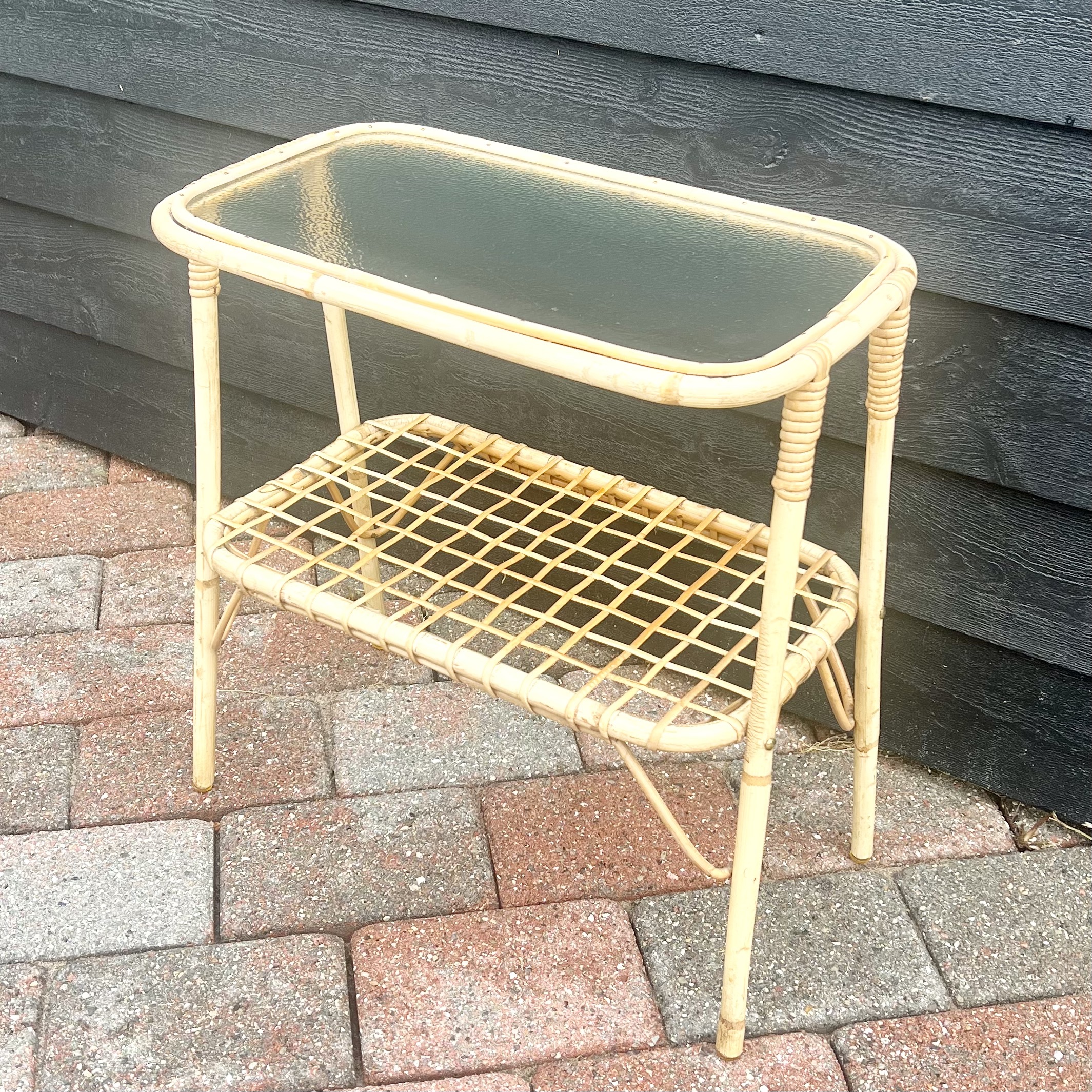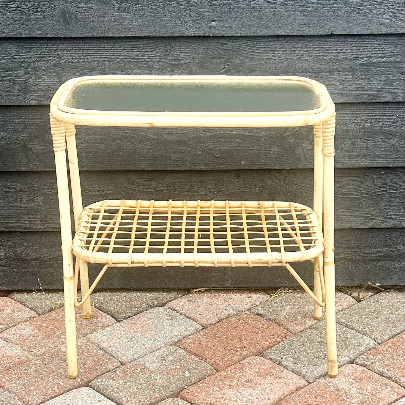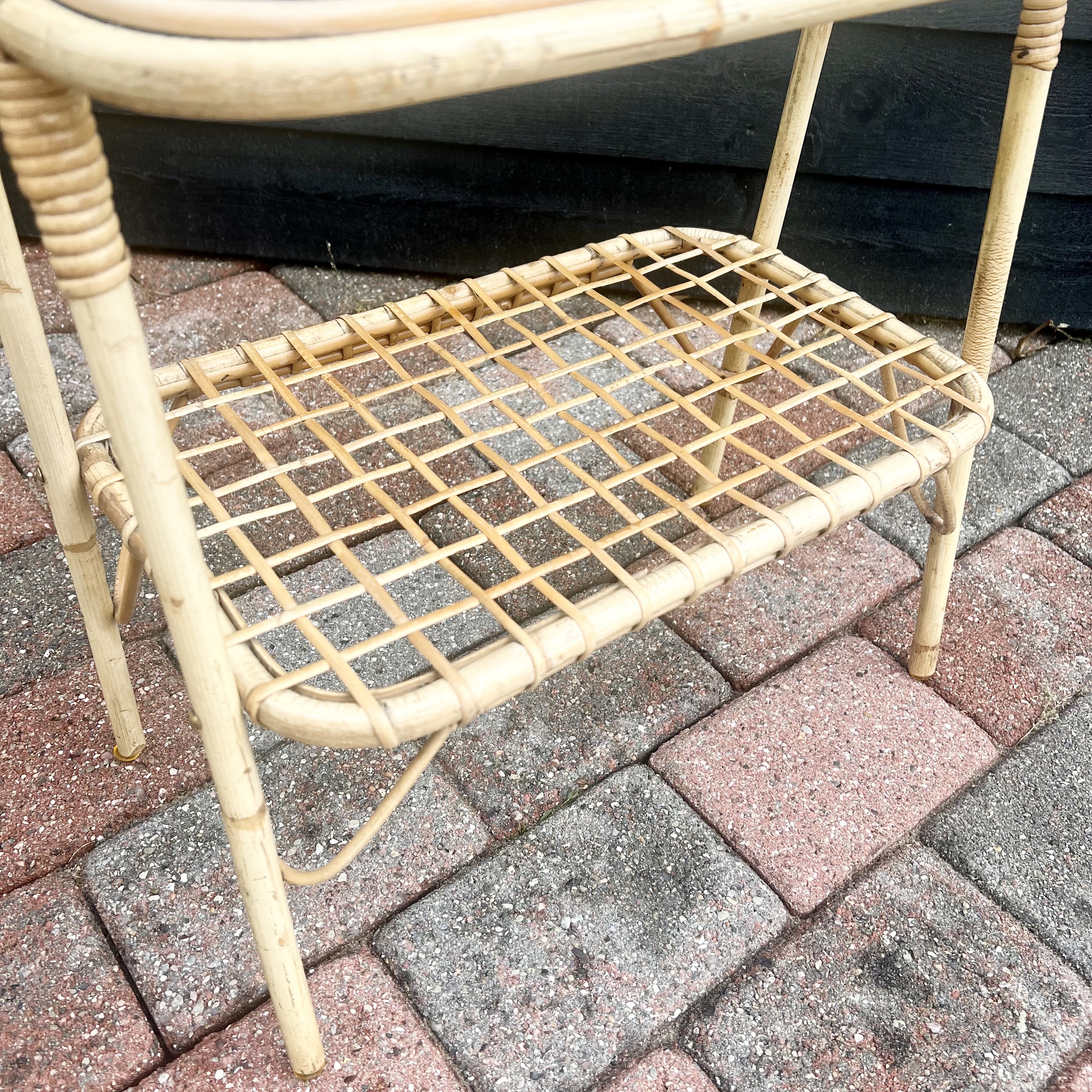 Super fint lille møbel med plads til magasiner mv. den flettede hylde.