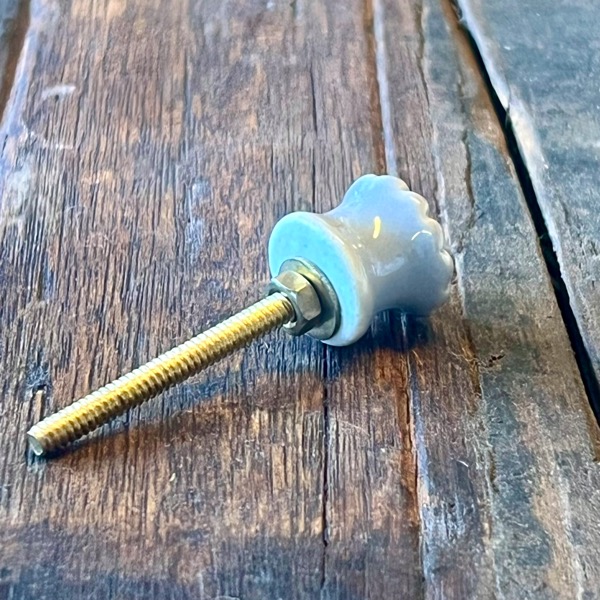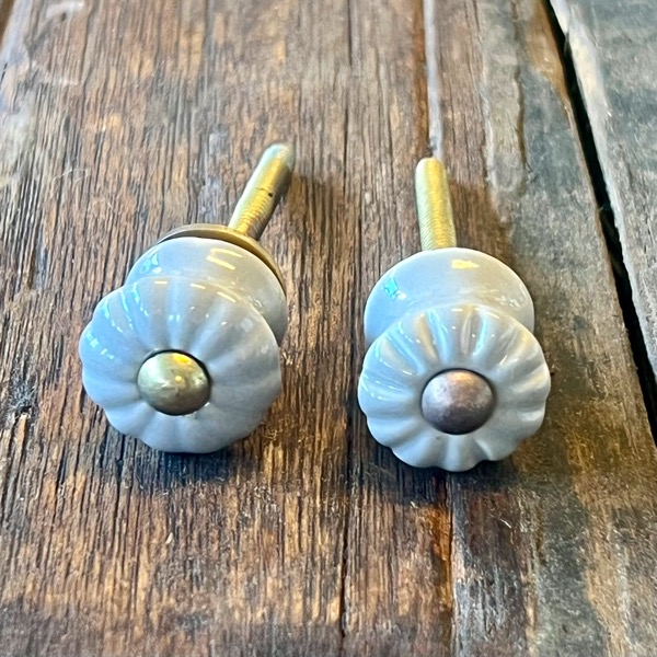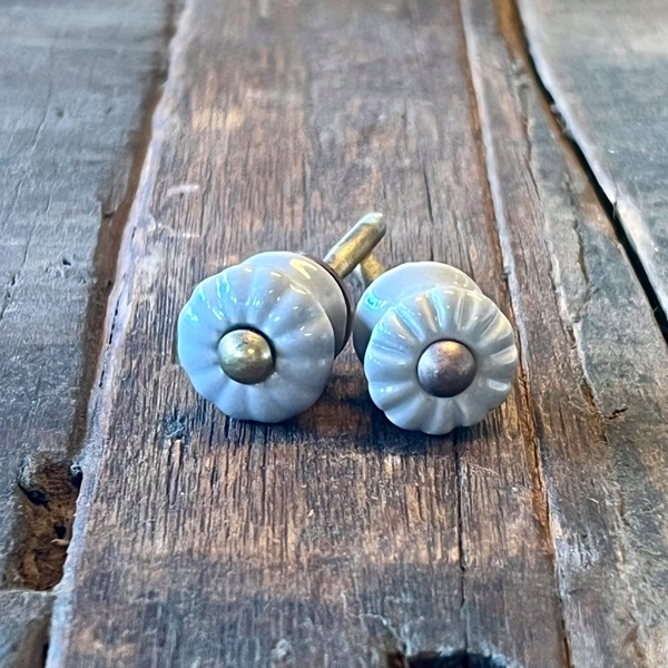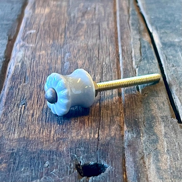 Finest lille møbelknop i lysegrå porcelæn og med guldfarvet skrue.