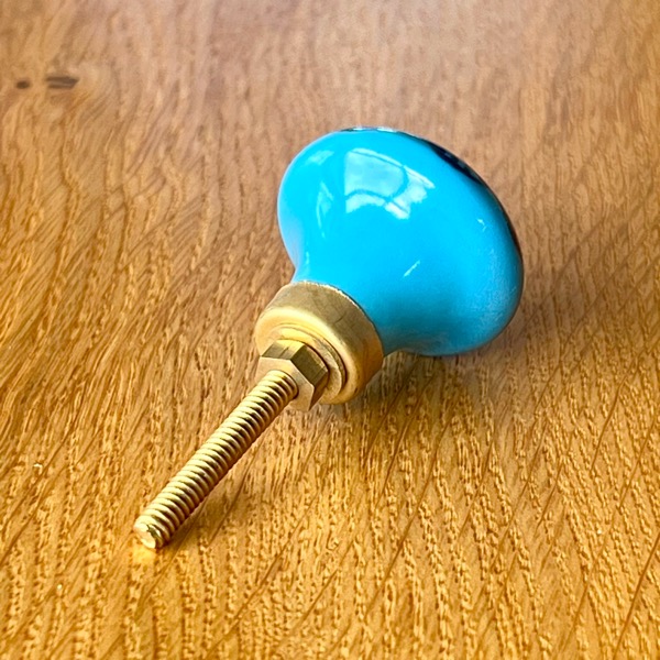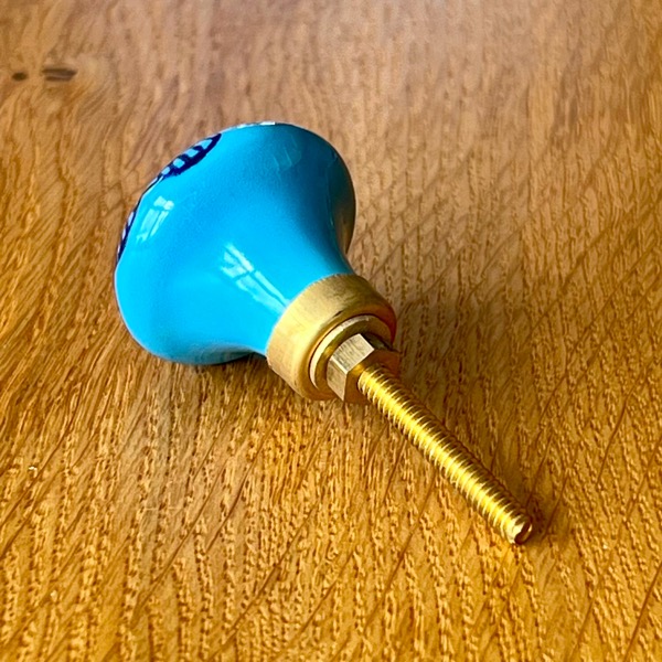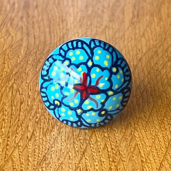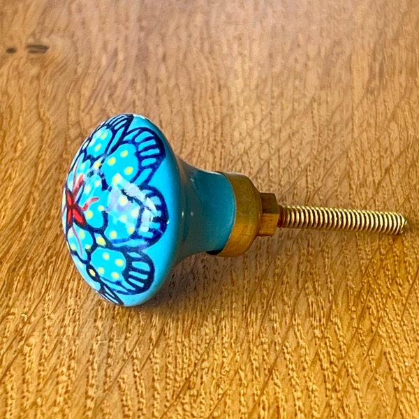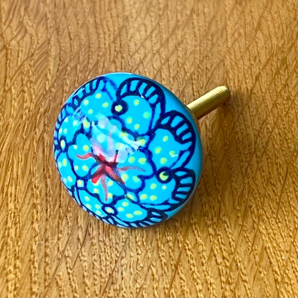 Smuk håndmalet porcelænsknop med blåt mønster.